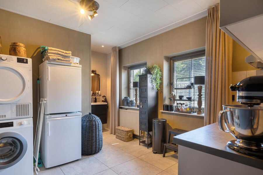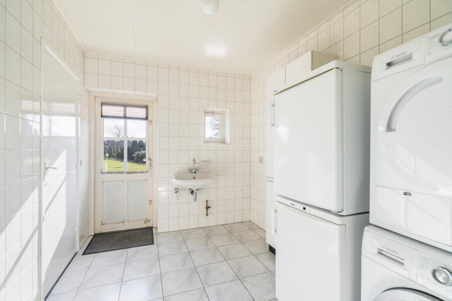 De bijkeuken is geheel betegeld, beschikt over een wastafel (met warm en koud water) en is voorzien van witgoedaansluitingen. De bijkeuken beschikt tevens over een ruime muurkast en biedt voldoende ruimte voor het plaatsen van een extra koelkast en/of vriezer. De bijkeuken is ook toegankelijk vanuit de voorzijde van de woning.