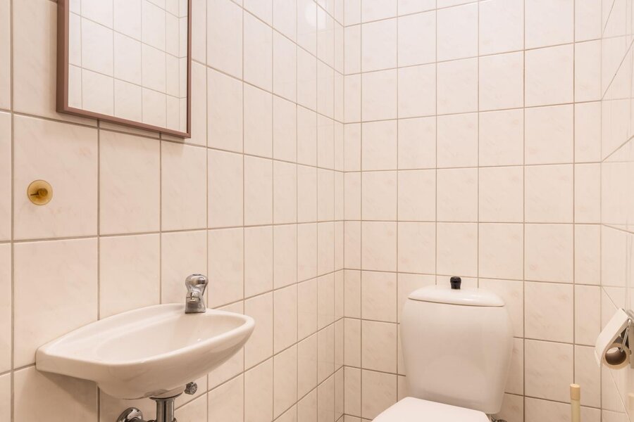 Geheel betegelde toiletruimte met een staand closet, een fonteintje en een ventilator.