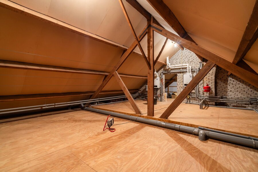 Zeer riante bergzolder met veel praktische bergruimte. De bergzolder biedt plaats aan de CV-ketels; 2x TrendLine HRC30 CW5 II (2019).