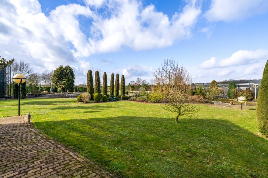 Vanuit het portaal bij naast de keuken is er toegang tot de riante tuin. De tuin bestaat uit een groot overdekt terras aan de woningzijde, meerdere looppaden, vijverpartijen, royale gazonpartijen, volières en grote borders met keien en volwassen bomen, planten en struiken. De tuin is op diverse plaatsen voorzien van elektra en verlichting. De tuin is tevens voorzien van een tweetal grondwaterpompen. De tuin is geheel omheind, heeft een uitstekende zonligging en geniet optimale privacy. Vanuit de tuin zijn de garage en het multifunctionele bijgebouw toegankelijk. De tuin is via de voorzijde toegankelijk via een afsluitbare looppoort en beschikt aan weerszijden over grote afsluitbare poorten.