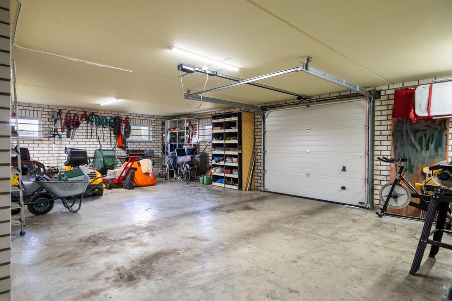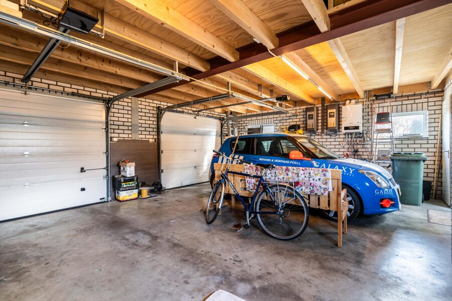 Vanuit de tuin is er toegang tot de grote tweedelige garage. De garages zijn in totaal voorzien van een drietal elektrisch bedienbare sectionaalpoorten en beschikken over veel praktische bergruimte, elektra, verlichting en water. De garage is volledig geïsoleerd en voorzien van verwarming. Het voorste gedeelte biedt plaats aan 2 auto's. In het voorste gedeelte zijn tevens de CV-ketel; TrendLine II HRC30 CW5 II (2025) en de omvormers van de 46 zonnepanelen (2012) gesitueerd. Het voorste gedeelte beschikt tevens over een riante vliering. De vliering is toegankelijk via een vaste trap. In het achterste gedeelte van de garage bevindt zich een toiletruimte.
