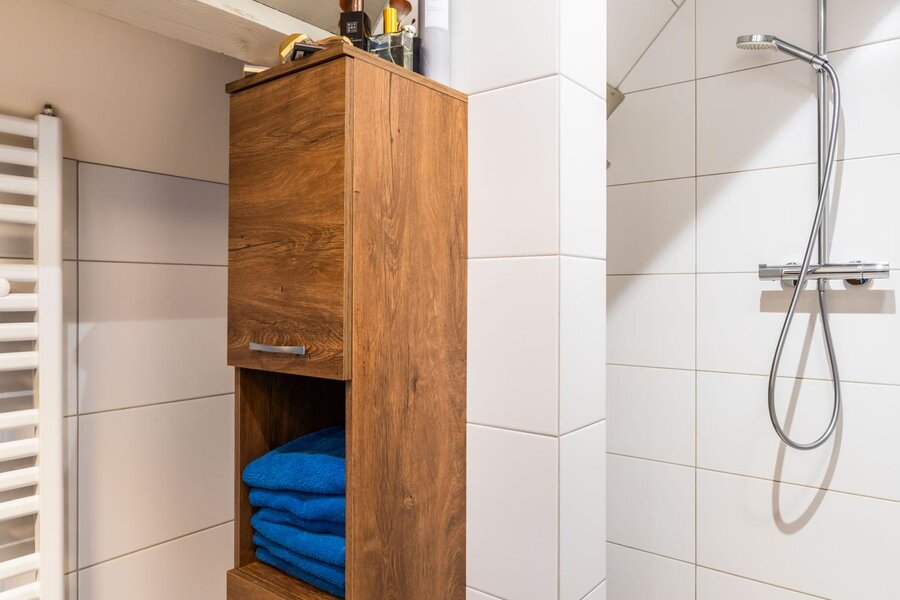 Via een separate entree aan de rechterzijde van de garage (straatzijde) is er toegang tot de ontvangsthal van de studio. De ontvangsthal is afgewerkt met een tegelvloer en beschikt over een tweetal ruime muurkasten. Via een vaste trap is er toegang tot de recent (2022) gerealiseerde studio. De studio bestaat uit een eet-, zit- en slaapgedeelte en beschikt over een moderne keuken, badkamer en toiletruimte. De keuken beschikt over een wandopstelling, bestaande uit diverse bergkasten, lades en een werkblad met spoelbak en inductiekookplaat. De keuken is tevens voorzien van een afzuigkap en een koelkast. In het schuine gedeelte bevinden zich ruime schuifkastenwanden met veel praktische bergruimte. De studio beschikt over een tweetal grote te openen Velux-dakramen en is tevens voorzien van airconditioning (2023). Het eetgedeelte en de keuken zijn afgewerkt met een tegelvloer en het zit- en slaapgedeelte met een laminaatvloer. De badkamer is geheel betegeld en voorzien van een inloopdouche, badkamerkasten, een designradiator en een wastafel met een modern bijbehorend wastafelmeubel en een spiegel met planchet en verlichting. De inloopdouche is voorzien van een draingoot en een thermostaatkraan met glijstang, handdouche en rainshower.