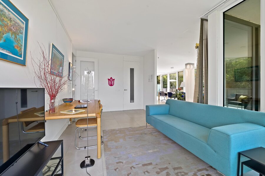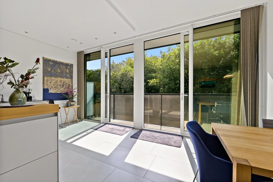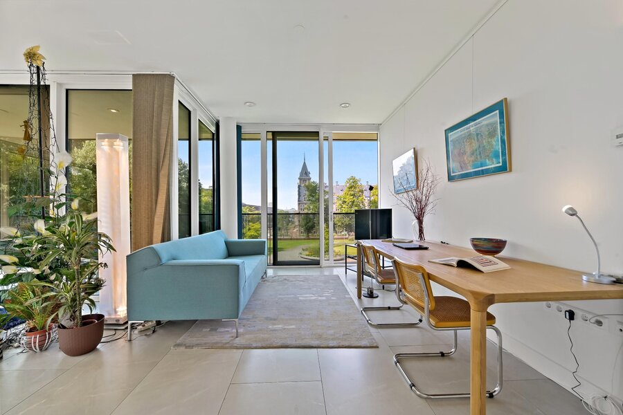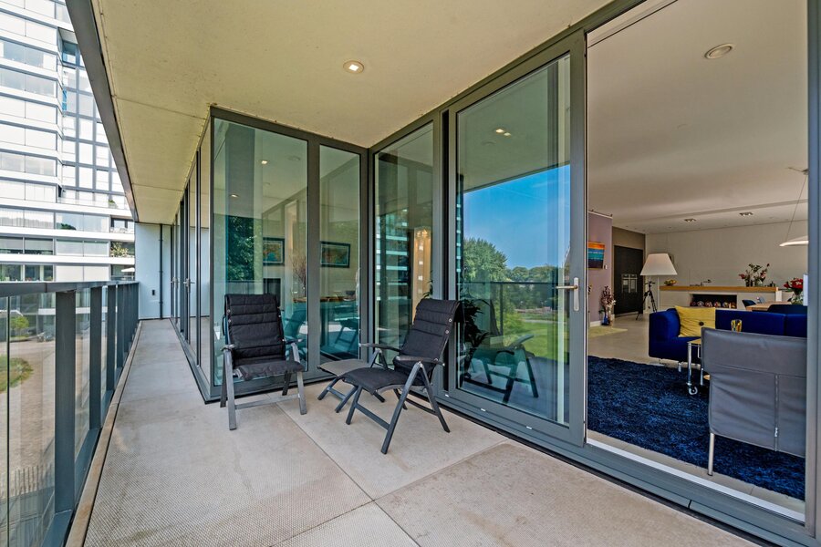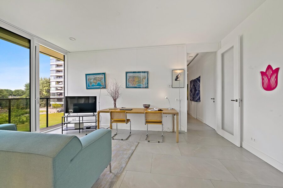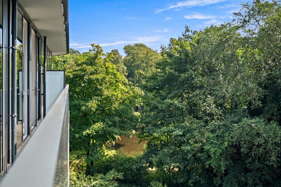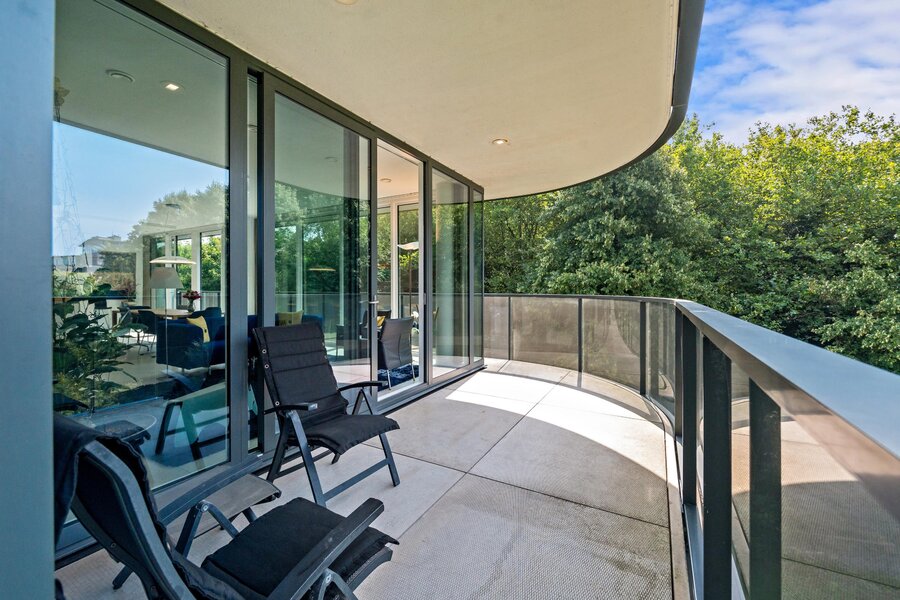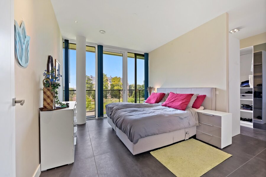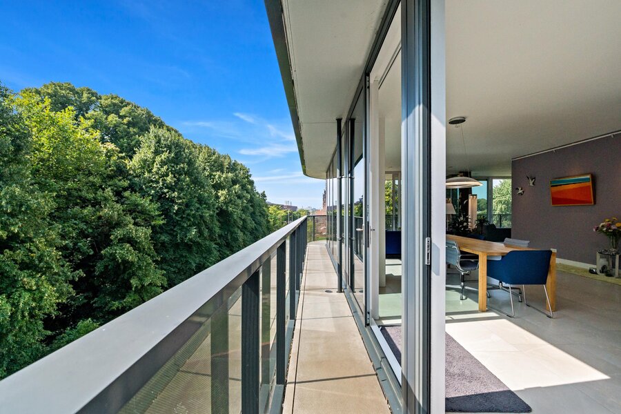 Dit appartement heeft twee tegenover elkaar geplaatste schuifpuien aan de boszijde om heerlijk te kunnen genieten van de ochtendzon.