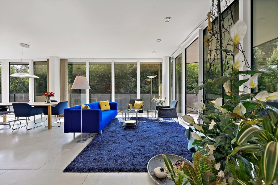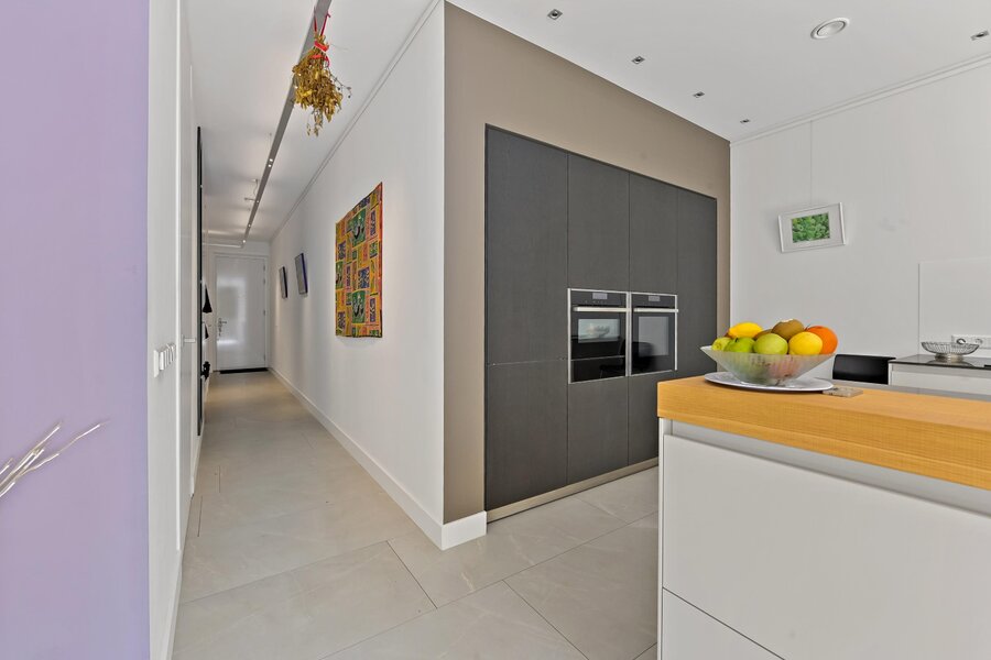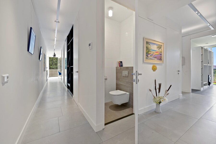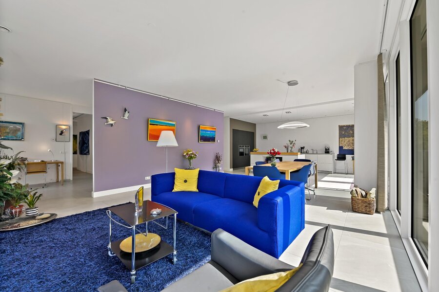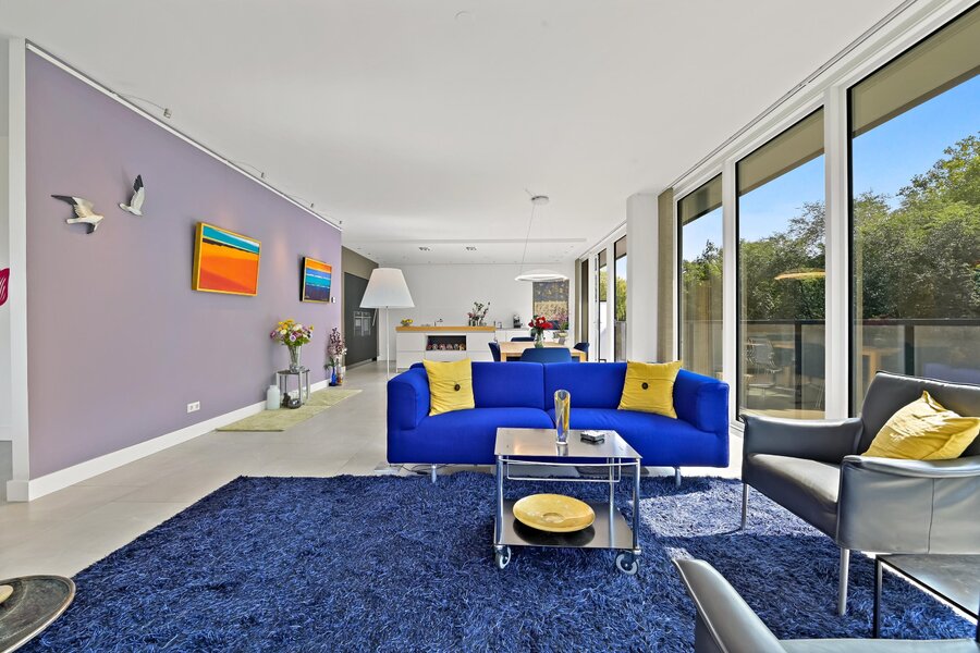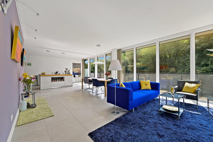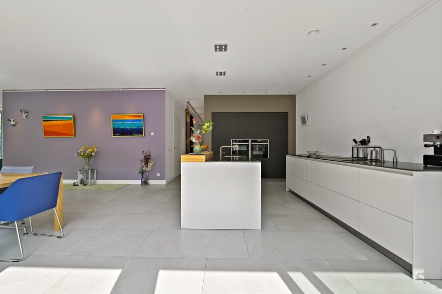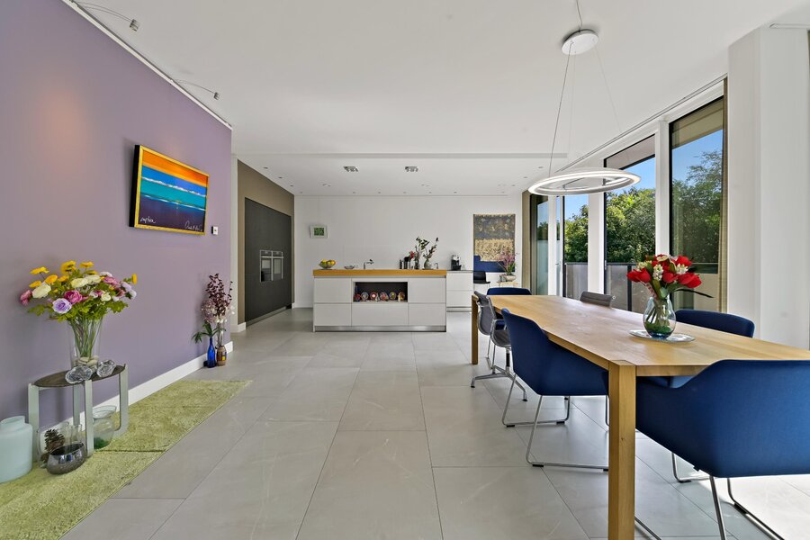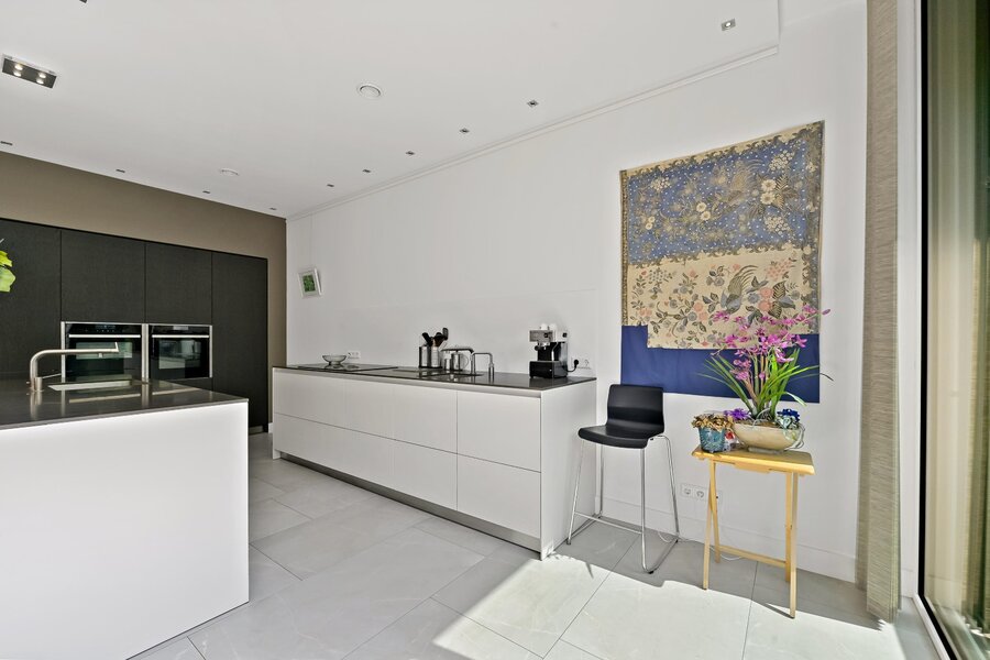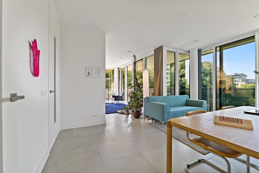 Entree woning. Hal/gang met inbouwgarderobenis met spiegel. Zeer lichte L- vormige woonkamer met samengevoegde voorzijkamer met glazenvensters van het plafond tot aan de grond. Moderne open keuken (Bulthaup) met inbouwapparatuur, twee spoelbakken en kokendwaterkraan.