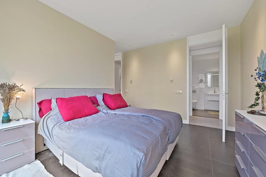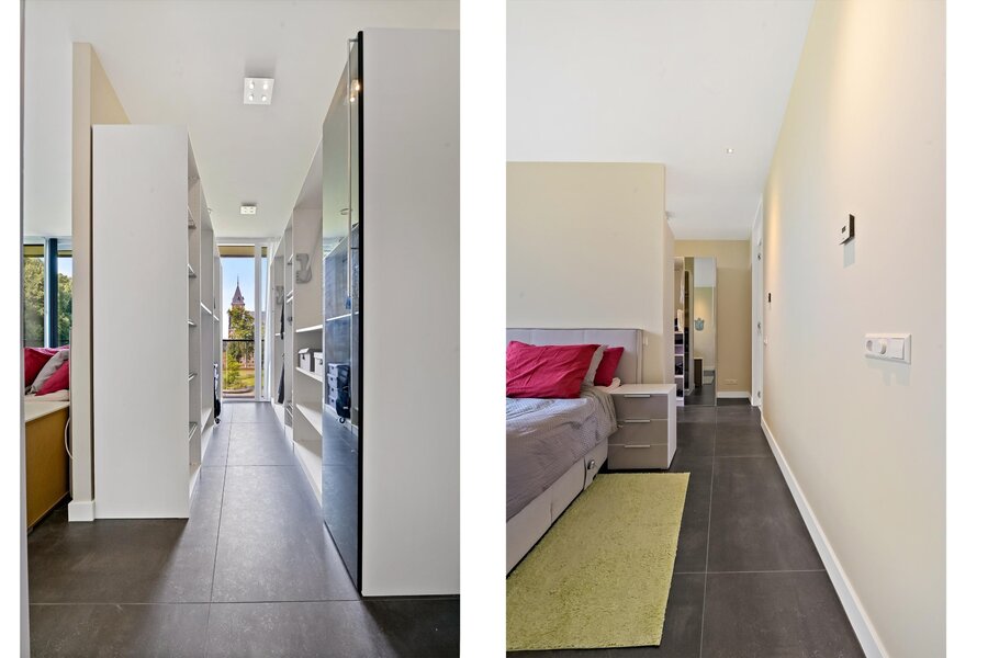 Bij de hoofdslaapkamer is de tweede zijslaapkamer samengevoegd om te gebruiken als kledingkamer met vaste kasten (blijven achter).