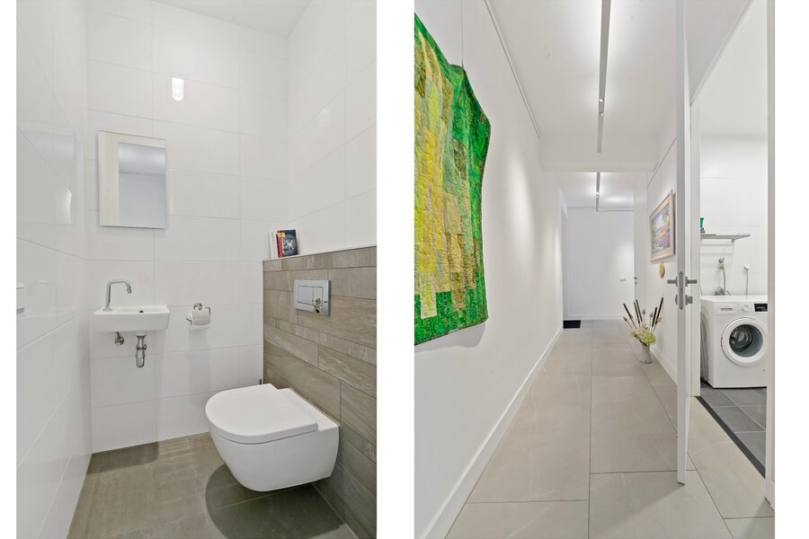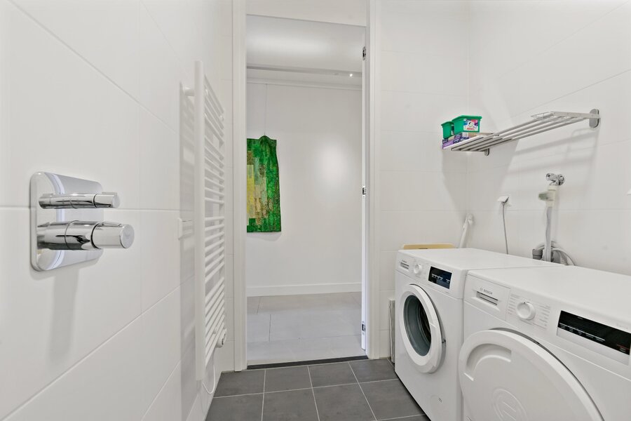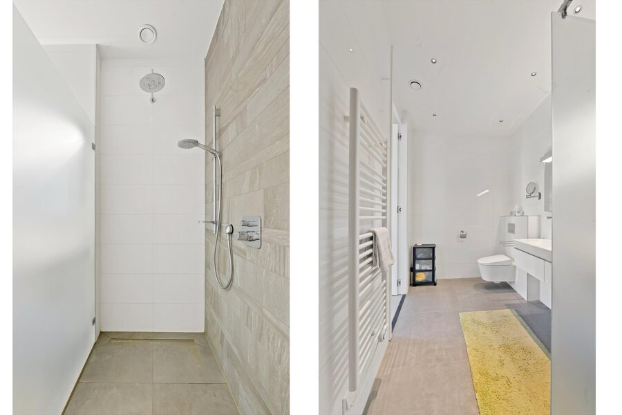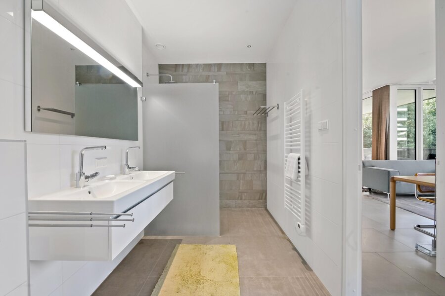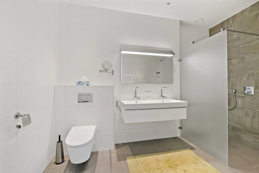 De badkamer is toegankelijk vanuit de gang en is voorzien van een royale inloopdouche, dubbele wastafel met ondermeubel en wandcloset.