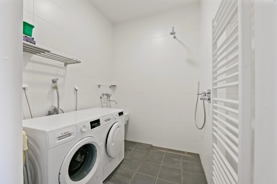 Verder is een wasruimte met een wasmachine en droger, stortbak, maar ook een douche. Voor de gasten is een aparte wc. Techniekruimte met een eigen gasgestookte warmtebron, WTW en plaats voor een extra koelkast. De buitenruimte is aaneengesloten en is ca. 30 m2 groot en ligt op het zuidwesten. Dus altijd een plekje te vinden om in de zon te kunnen zitten.