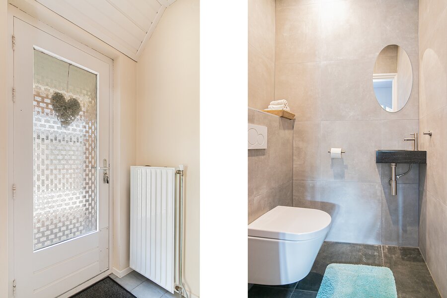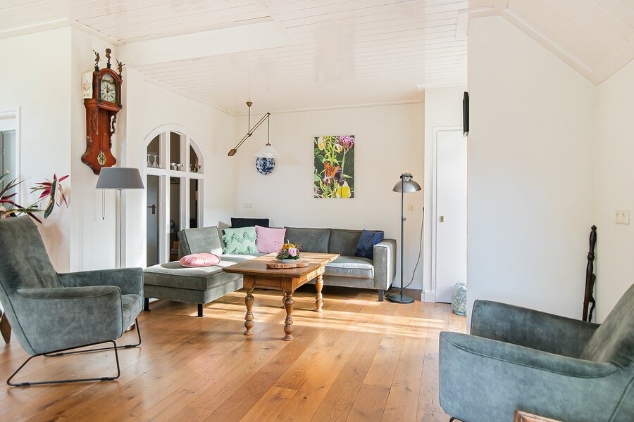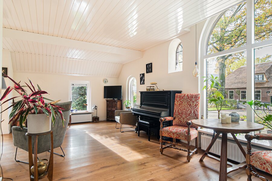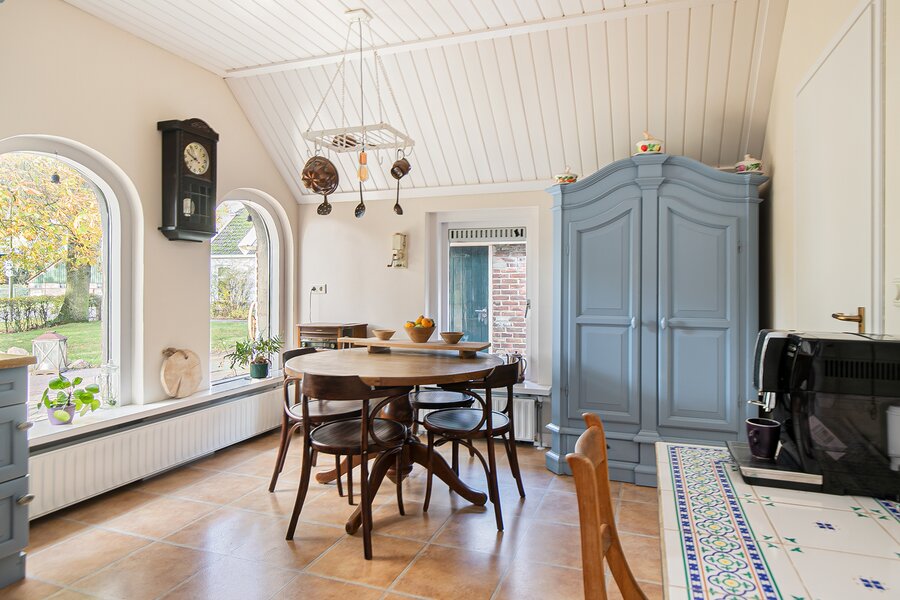 Kenmerkend voor de woonboerderij zijn de hoge vensters aan de voorzijde en de diep doorlopende kap waardoor een mooie combinatie van licht maar ook geborgenheid ontstaat. De entree bevindt zich aan de linkerzijgevel en deze komt uit in de hal waar u de keuze heeft richting de bijkeuken (met warmtepomp! en was-/droogopstelplaats) of naar de woonkeuken aan de voorzijde. Een knusse en gezellige woonkeuken met zicht over de voortuin en de beweging van de vogels, dat is fijn de dag starten! De keuken geeft toegang tot de (wijn-)kelder en de fantastische woonkamer.