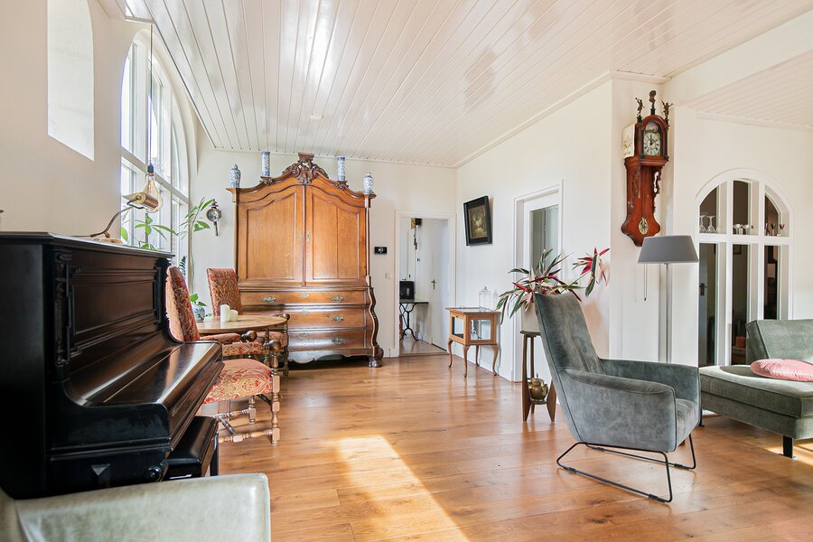 Want ook deze woonkamer is aan de voorzijde gesitueerd met een beleving die u echt even zou moeten ervaren. De hoog (gebogen) glaspartijen, sfeervolle eiken vloer en het lichtinval gedurende de dag via diverse zijden maakt dit een uiterst serene plek. Thans in de huidige setting maar op (vrij) eenvoudige wijze te vergroten en te verhogen, naar ieders wens.