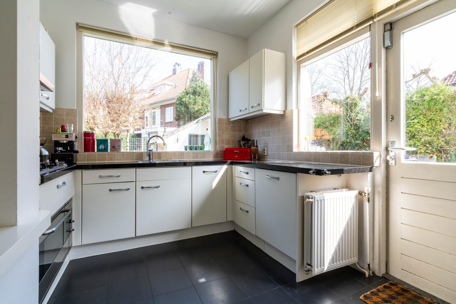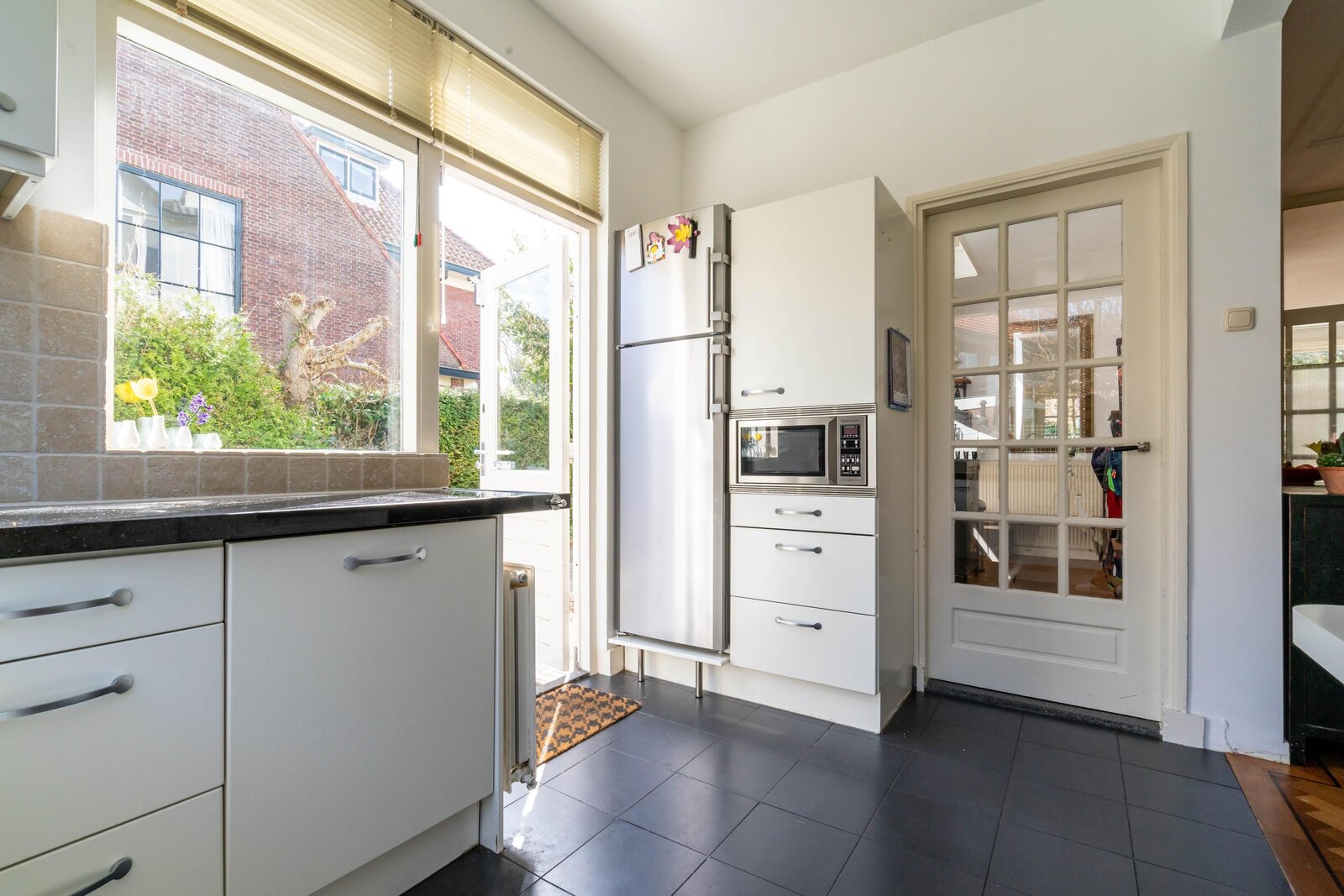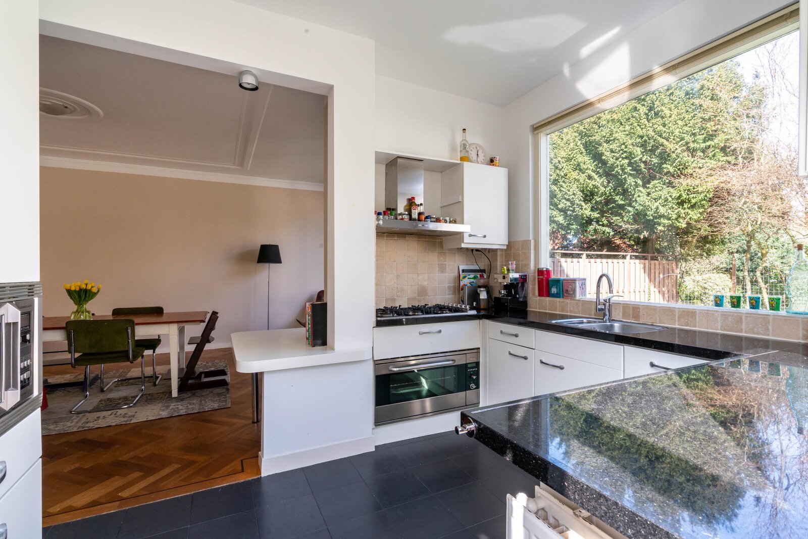 De moderne open keuken is uitgevoerd met een stenen werkblad en diverse inbouwapparatuur en biedt tevens toegang tot de zijkant van de woning en de garage.