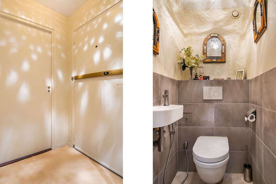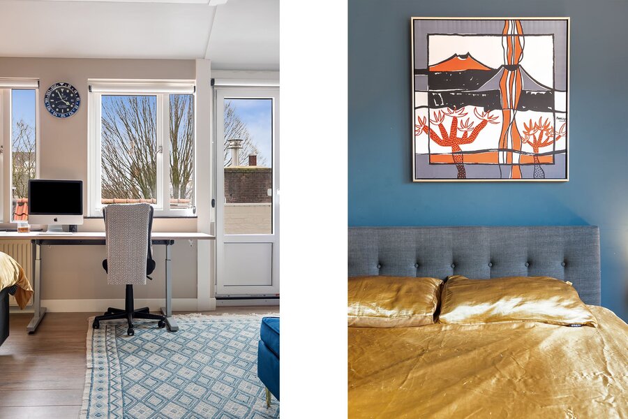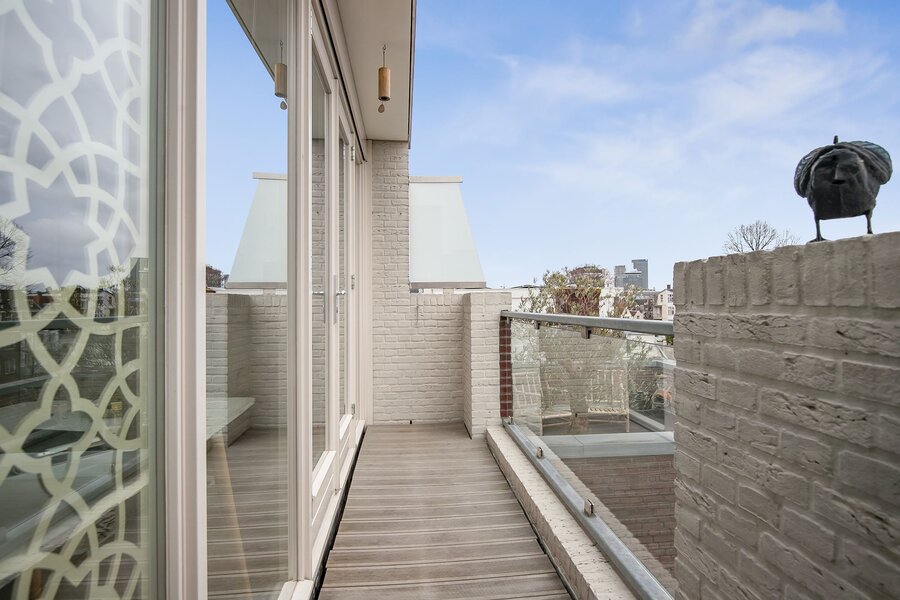 De slaapkamer is royaal opgezet en voorzien van veel natuurlijk daglicht inval met dank aan de vele raampartijen. Ook kun je vanuit hier naar het woningbrede balkon met prachtig uitzicht op onder meer het Paleis op de Dam. Met directe toegang tot een terras en een ensuite badkamer die uitnodigt tot ontspanning.