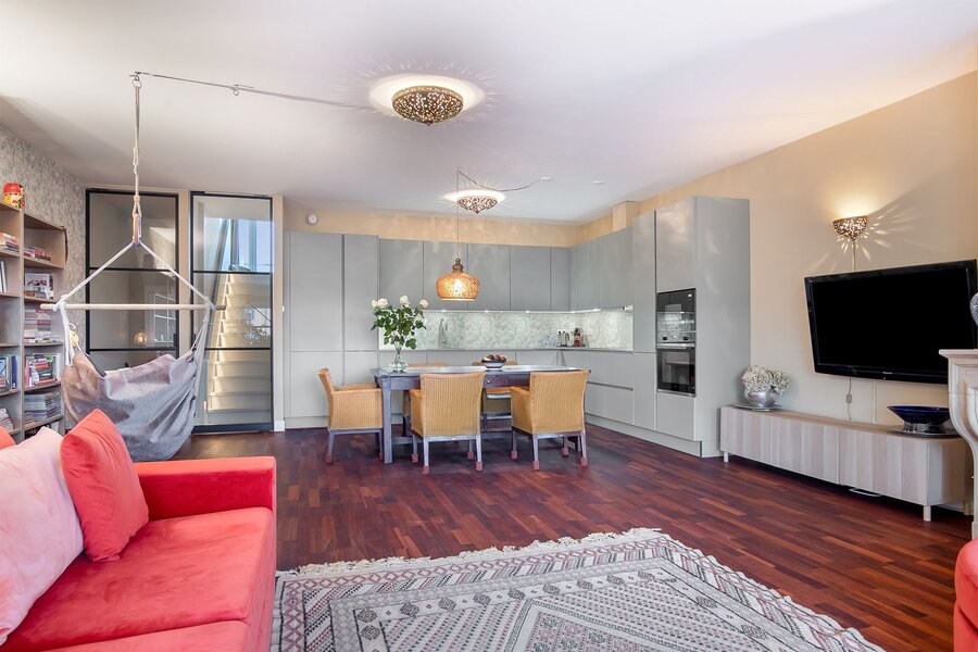 De keuken, een meesterwerk van design, is uitgerust met topapparatuur voor de fijnproever. Hier tref je namelijk lichtblauwe, greeploze keukenkasten met een licht keukenblad aan. Tevens is de keuken voorzien van een inductiekookplaat, afzuigkap, twee inbouwovens en een inbouw koel-/vriescombinatie. Kortom, hier kom je absoluut niets tekort.