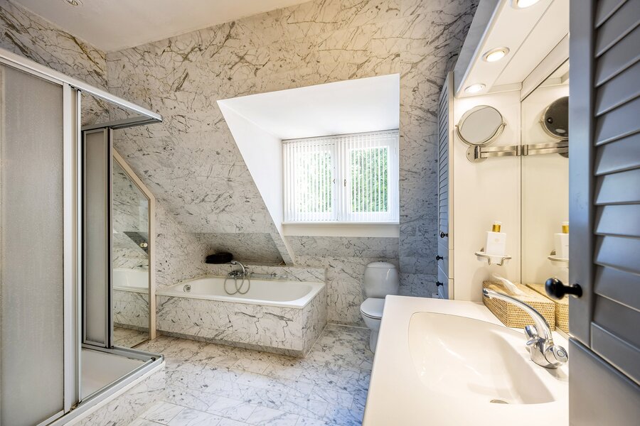 Middels een fraaie royale trappartij, bereikt u de eerste verdieping van de villa. Op deze verdieping bevinden zich drie zeer ruime slaapkamers, die geen van alle identiek zijn. De ruime badkamer is gecentreerd op deze verdieping en is voorzien van, douche, wastafel, toilet en een ligbad. De eerste verdieping biedt tevens een wasmachine/-droger ruimte.