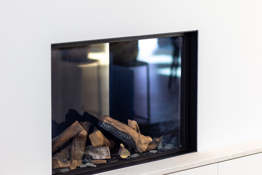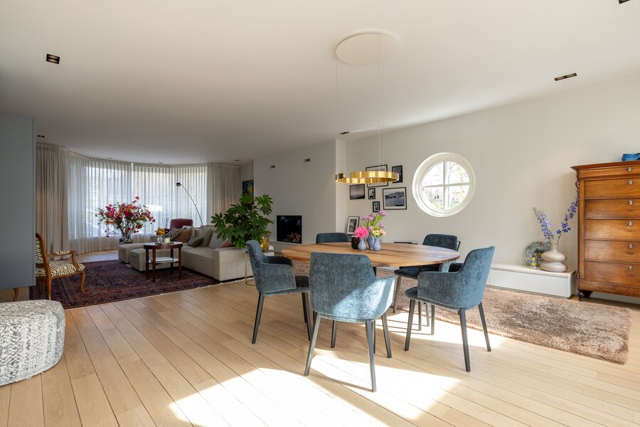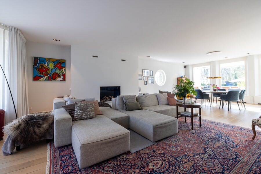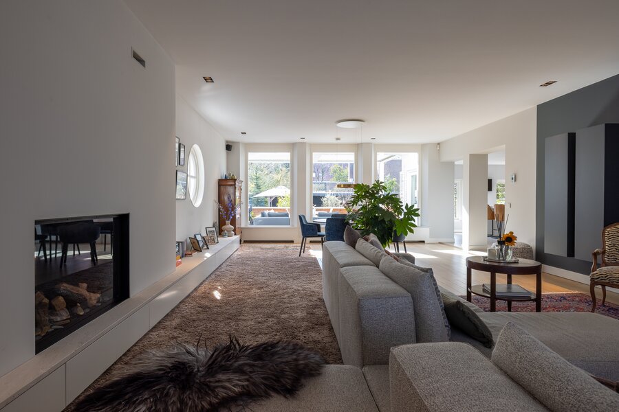 De ruime en lichte woonkamer wordt gekenmerkt door grote raampartijen aan weerszijden, waardoor natuurlijk daglicht de ruimte prachtig verlicht. De sfeervolle open haard draagt bij aan de warme en uitnodigende ambiance. Of u nu dineert aan het kookeiland of aan de royale eettafel in de woonkamer, hier ervaart u ultiem wooncomfort.