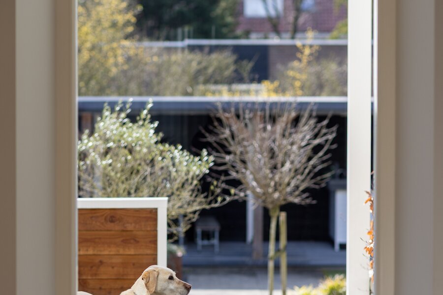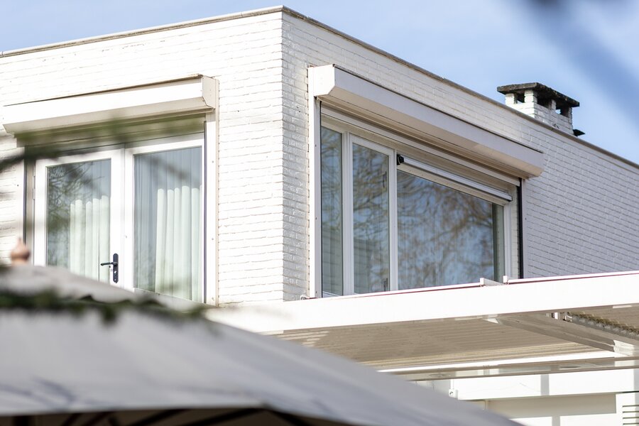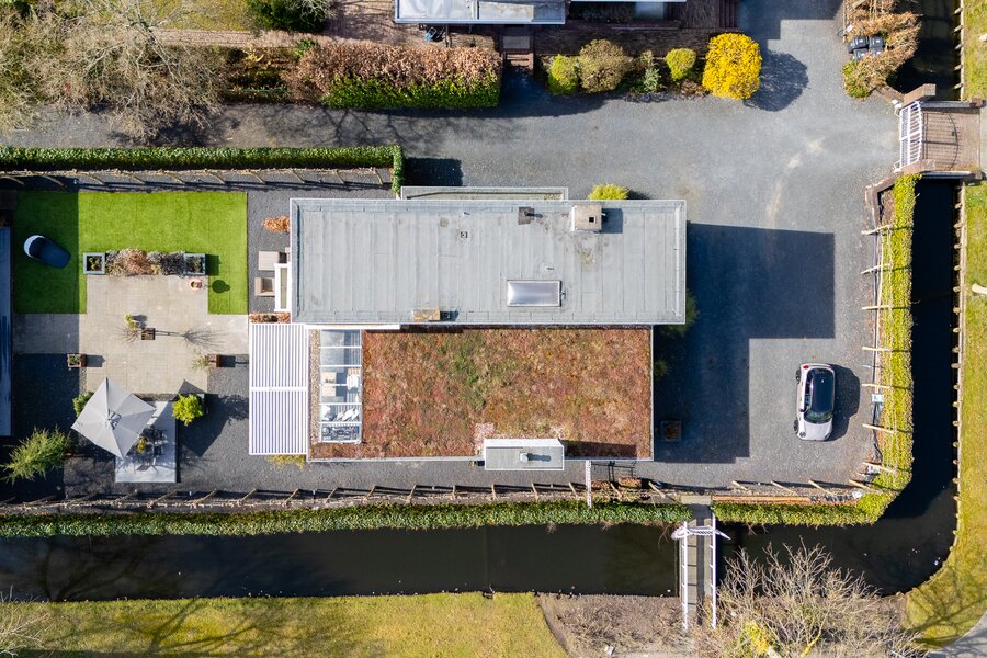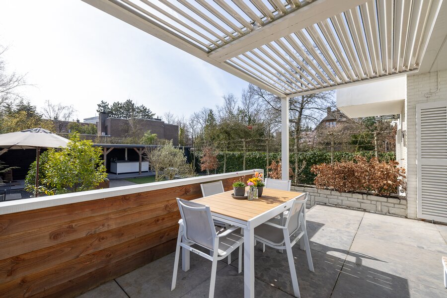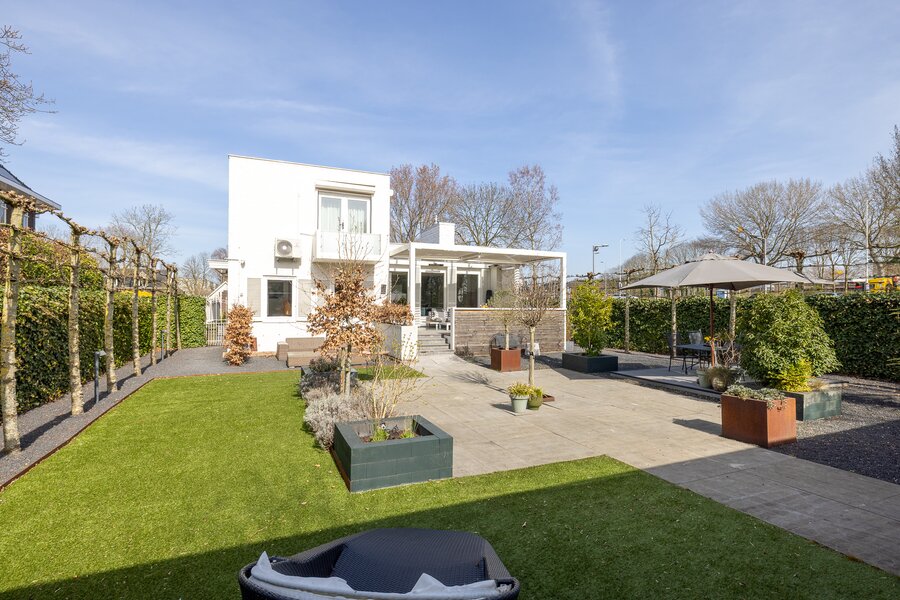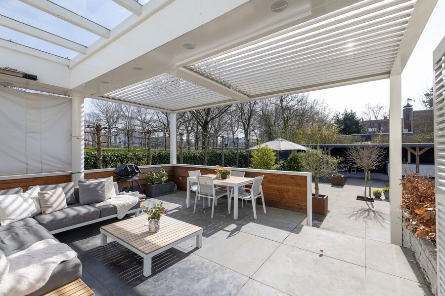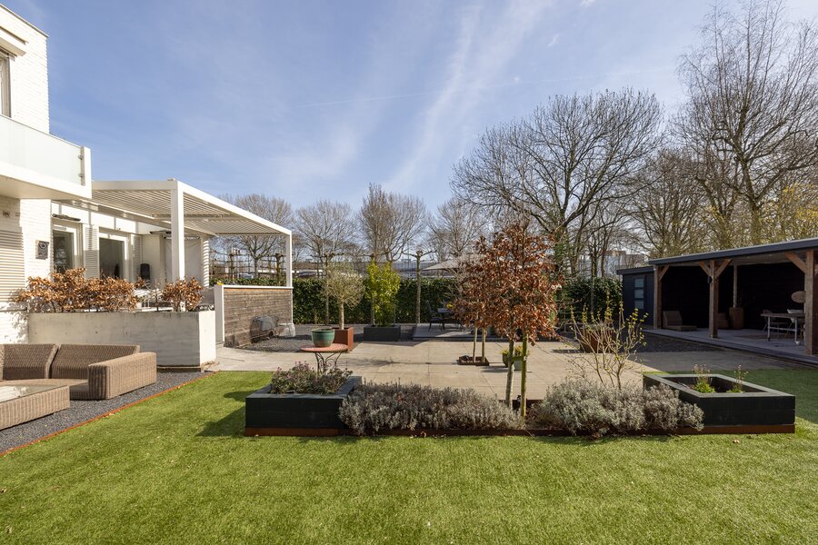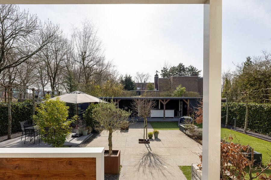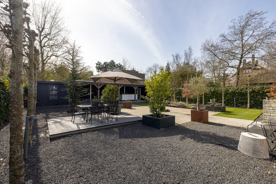 De villa is omgeven door een prachtig aangelegde tuin met diverse zitplekken, waardoor u op elk moment van de dag kunt genieten van de zon of juist de schaduw op kunt zoeken. Direct aan het huis grenst een stijlvol overdekt terras met heaters en draaibare lamellen in het dak. Dankzij de lichtstraten blijft de woonkamer heerlijk licht en open.