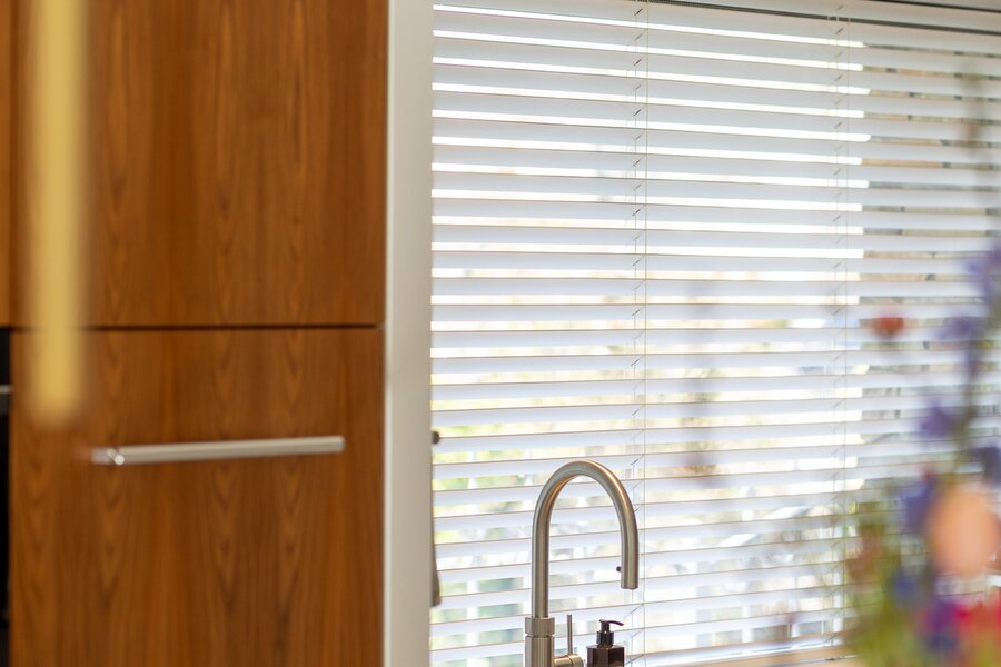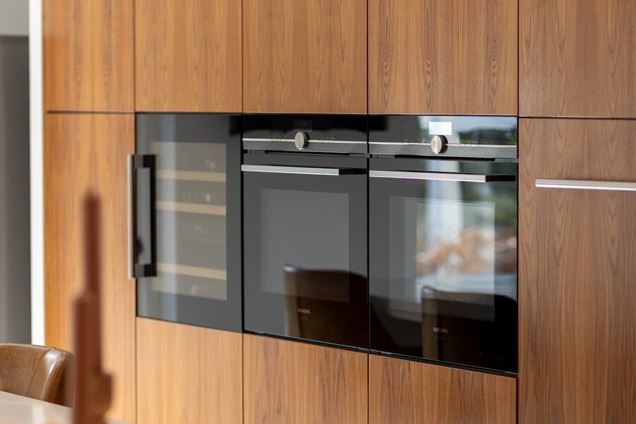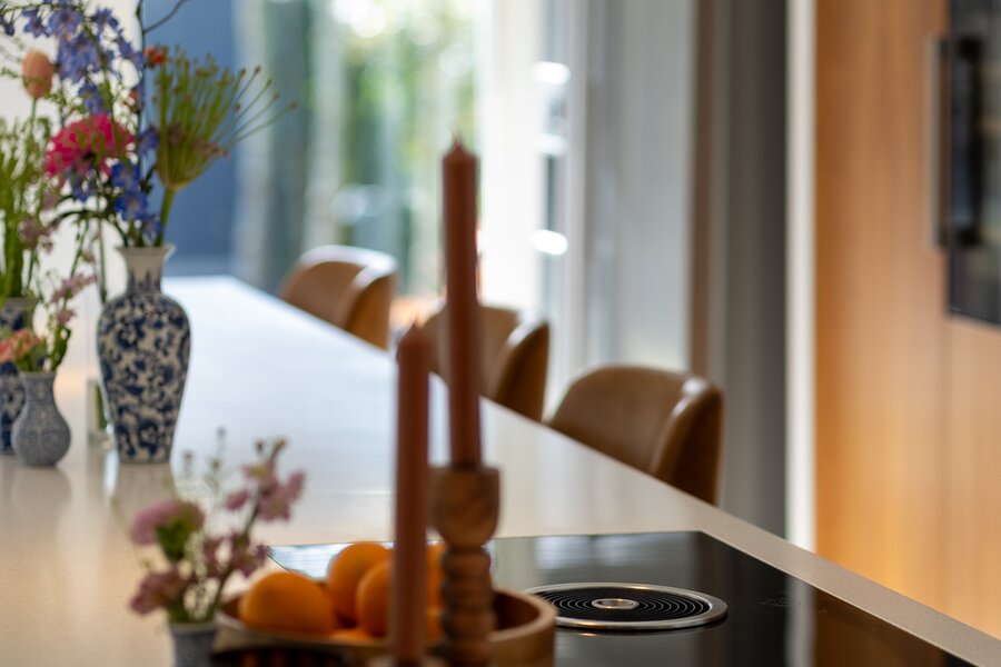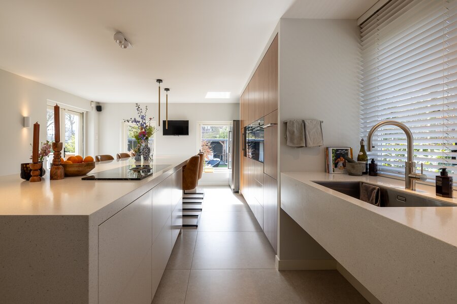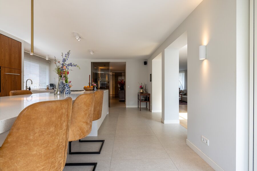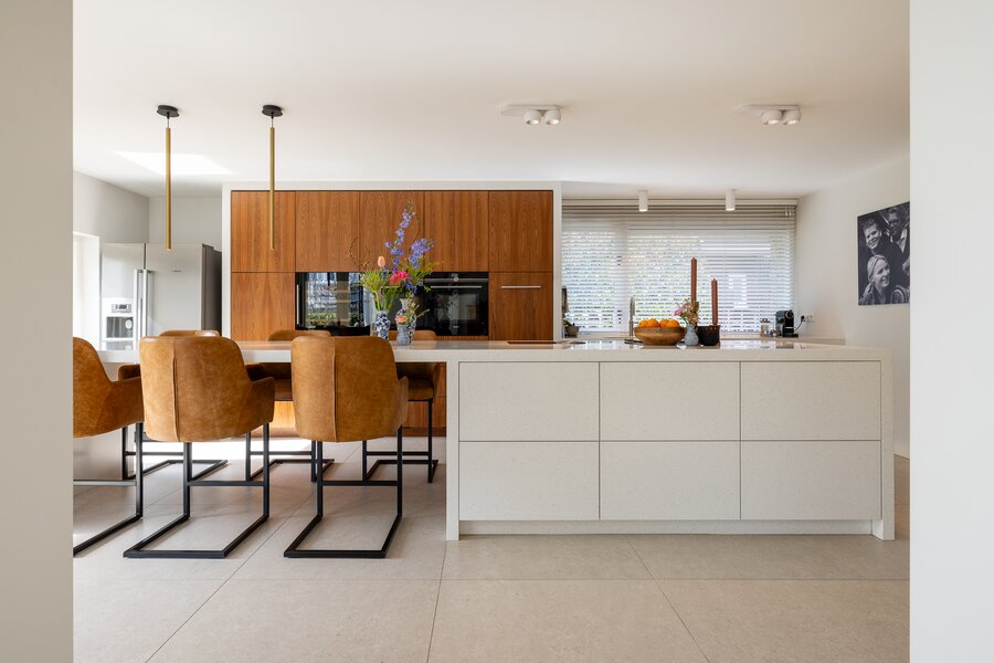De indrukwekkende woonkeuken is een ware blikvanger en volledig op maat gemaakt. Het vijf meter lange kookeiland met een handgemaakt werkblad is voorzien van een geavanceerde inductiekookplaat met geïntegreerde afzuiging. Daarnaast beschikt de keuken over een wijnklimaatkast, oven, combimagnetron en vaatwasser op hoogte, perfect geïntegreerd in de elegante wandopstelling.
