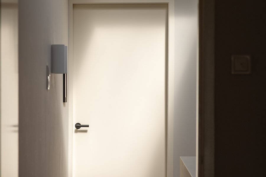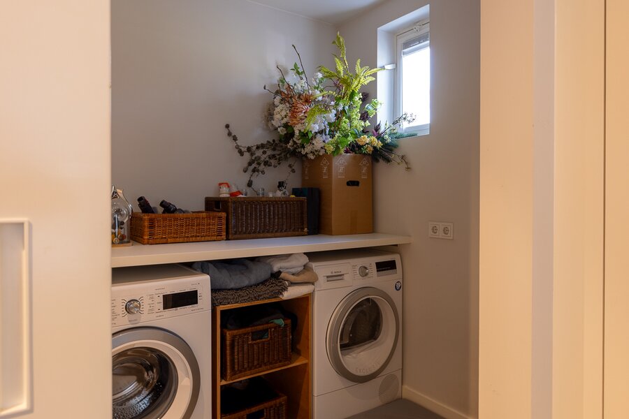 Achterin de gang bevindt zich een multifunctionele ruimte die ideaal kan dienen als werkkamer, slaapkamer, speelkamer of hobbyruimte. Deze kamer kan desgewenst worden afgesloten met schuifdeuren. Verder is er een aparte ruimte voor de wasmachine en droger, eveneens voorzien van een praktische schuifdeur.
