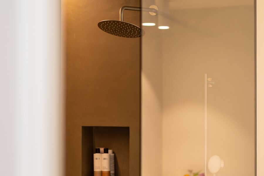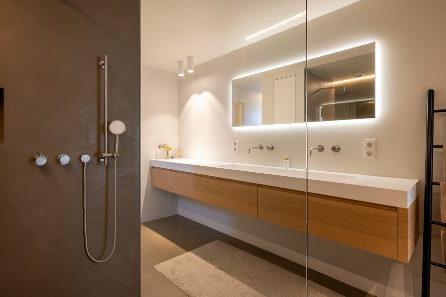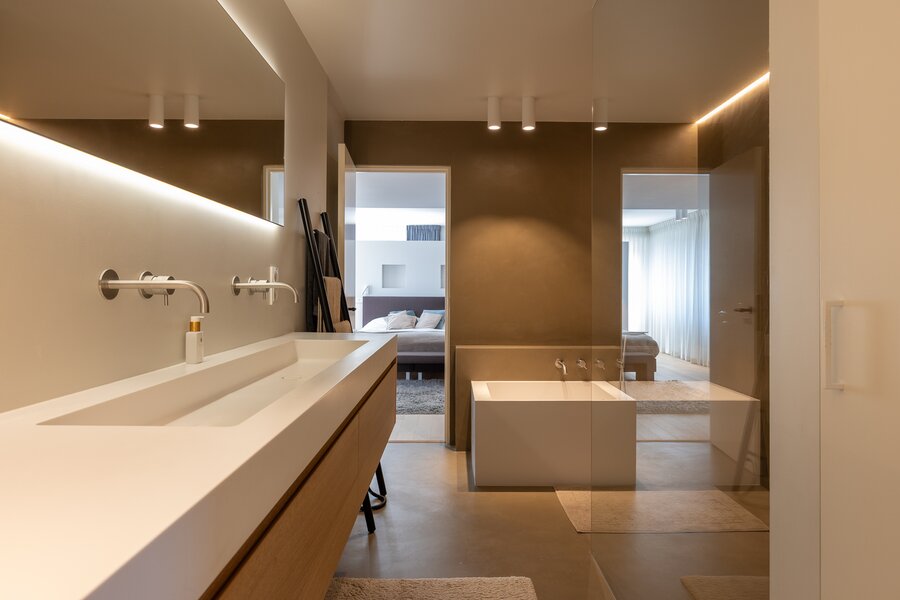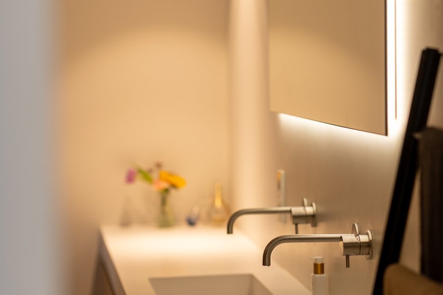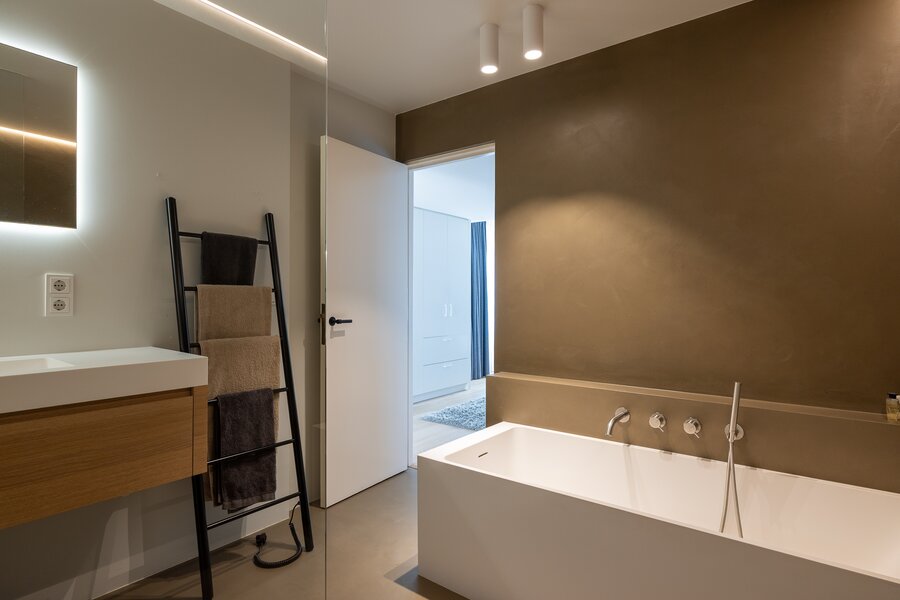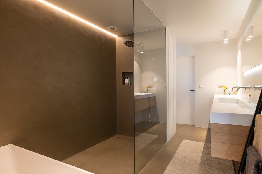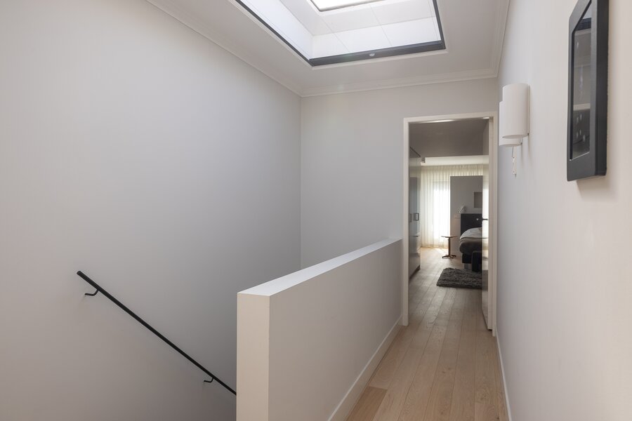 Op de eerste verdieping zorgt een lichtkoepel voor een prachtige lichtinval. Hier bevinden zich twee ruime slaapkamers, waaronder een riante masterbedroom en een stijlvolle logeerkamer. De luxe badkamer, die vanuit beide slaapkamers toegankelijk is, is uitgerust met een royale inloopdouche, een comfortabel ligbad en een extra groot wastafelmeubel met veel opbergruimte. Een separaat toilet is discreet uit het zicht geplaatst.