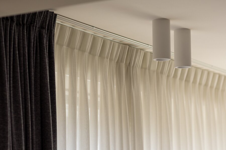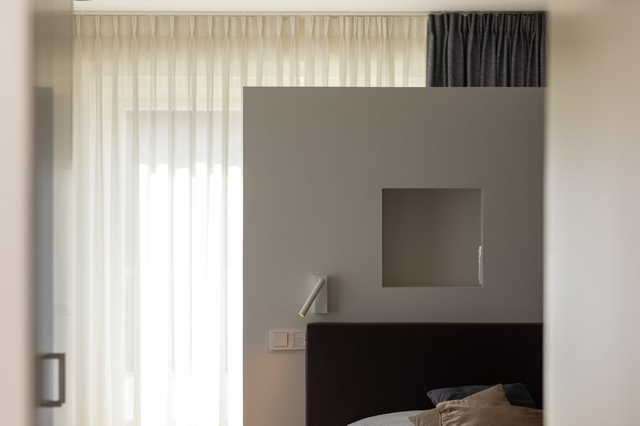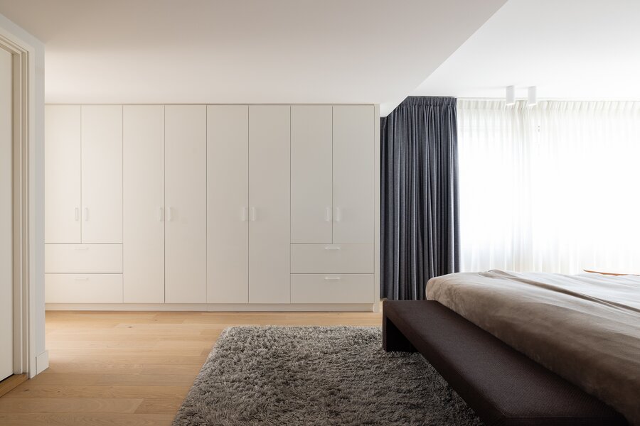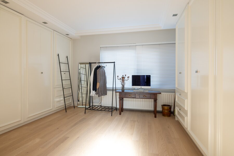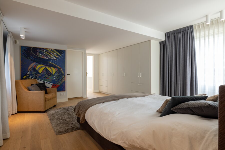 De masterbedroom biedt volop opbergruimte en kan desgewenst nog worden uitgebreid met extra kasten achter de roomdivider. Deze kamer is tevens voorzien van airconditioning en twee stalen rolluiken voor extra comfort en privacy. De logeerkamer beschikt over op maat gemaakte kasten en kan ook perfect dienst doen als tweede slaapkamer.