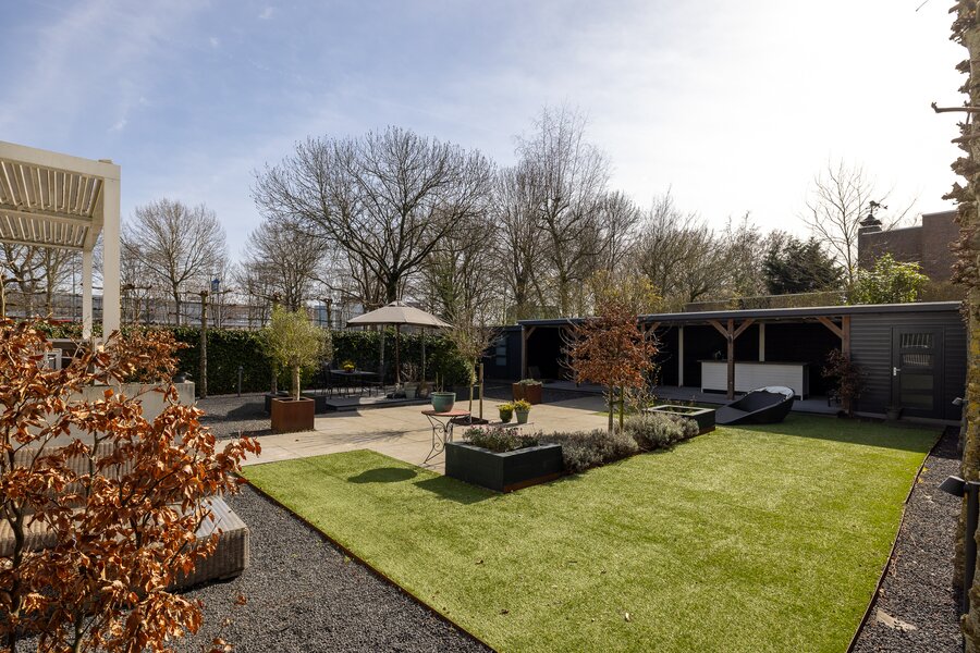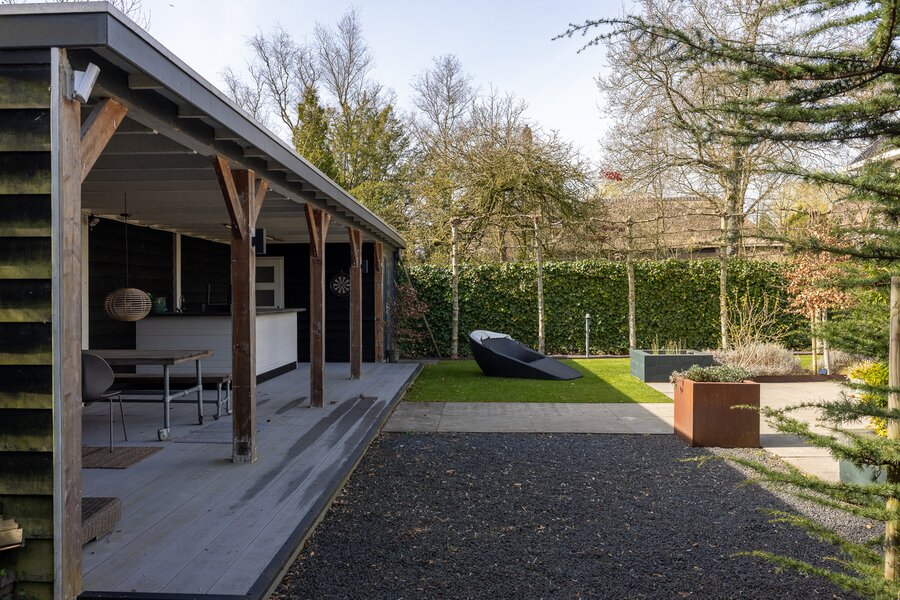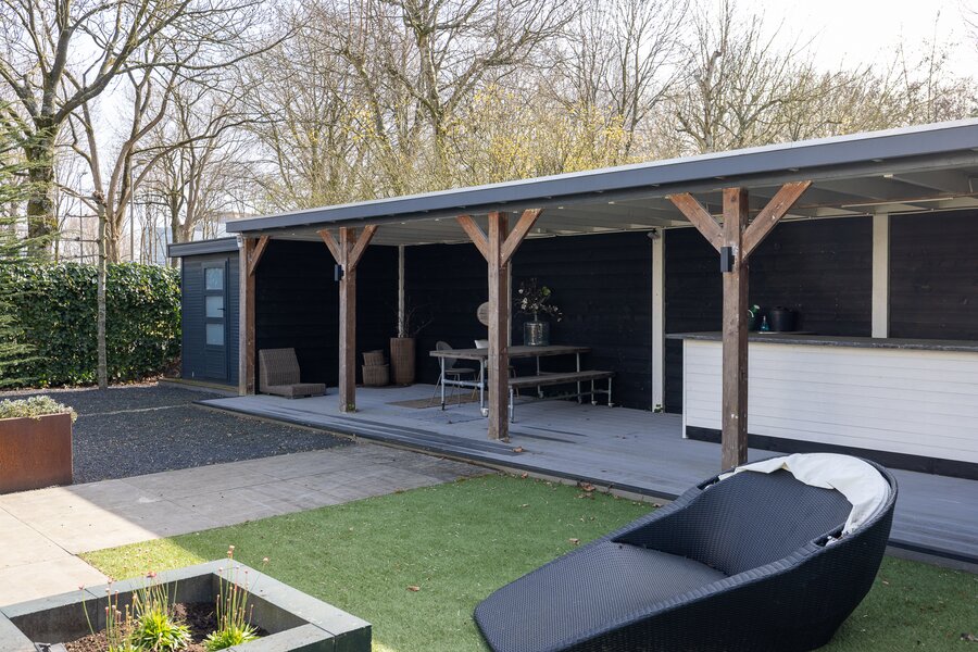 Achter in de tuin bevindt zich een exclusief tuinhuis van maar liefst 15 meter lang. Dit veelzijdige bijgebouw beschikt over twee bergingen, een toilet en een keukenblok, waardoor het perfect kan dienen als extra ontspanningsruimte of gastenverblijf.