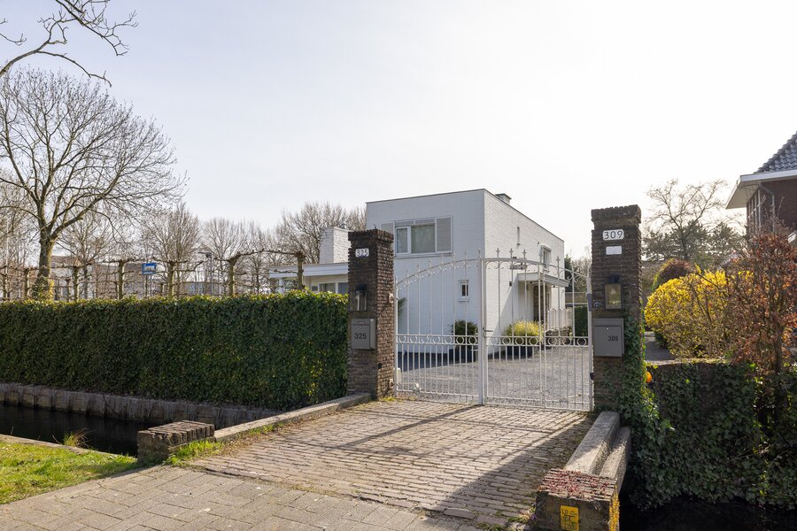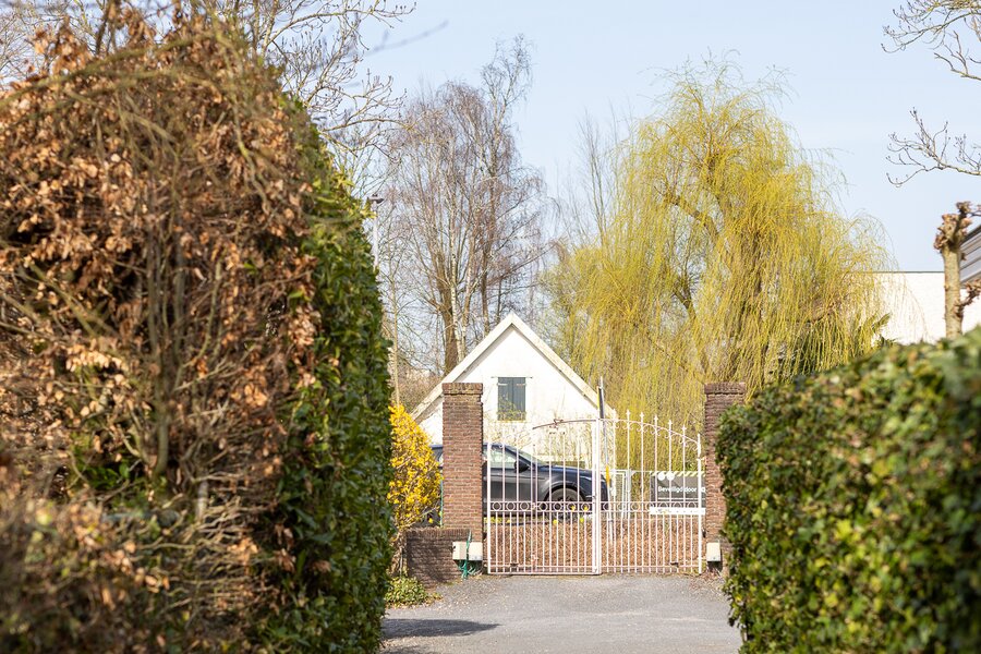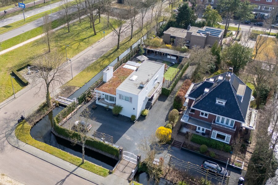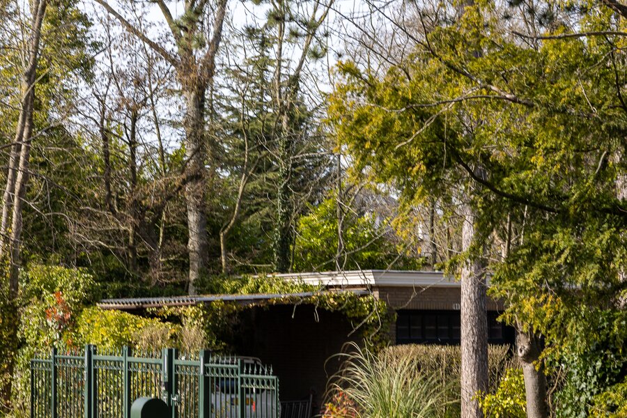 De villa is fraai gesitueerd en wordt omgeven door een weelderige haag van klimop en leiplatanen, wat optimale privacy biedt. Op het eigen terrein zijn diverse parkeeropties beschikbaar, zowel voor het huis als in de garage achter op het perceel.