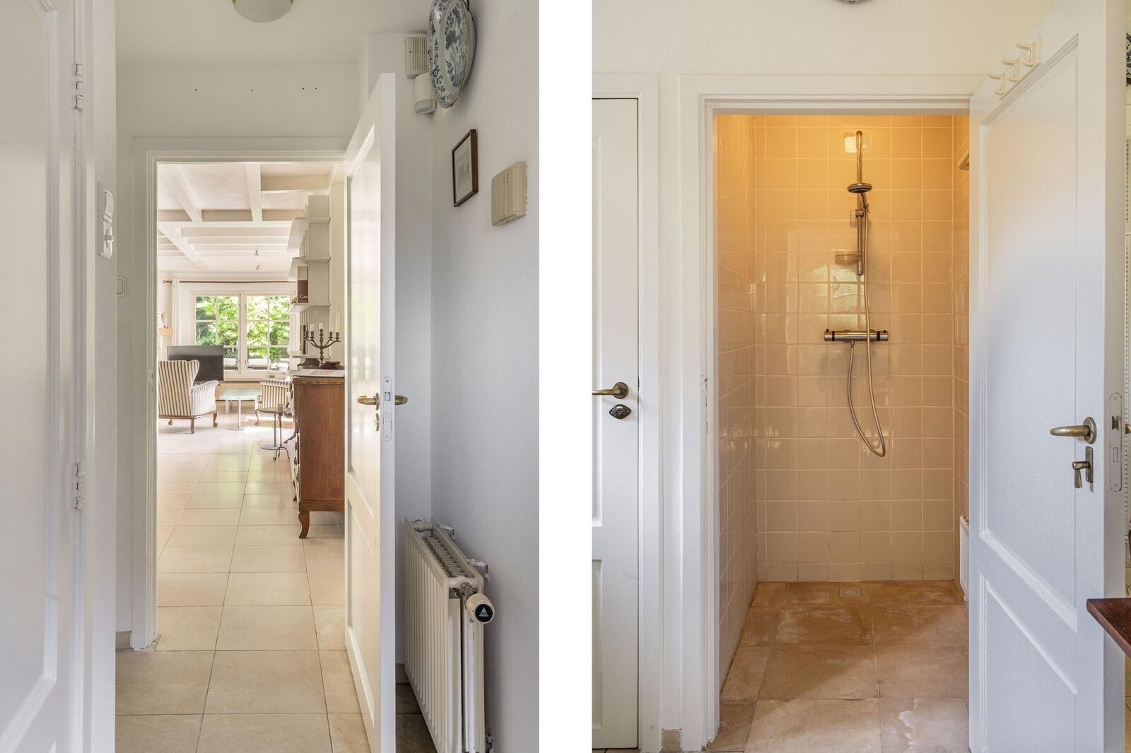 Achter de voordeur vinden we de royale entree met garderobe, trapopgang naar de eerste verdieping, meterkast en de toegang tot zowel de woonkamer, de douche, toilet, (extra) badkamer als de keuken. De badkamer op de begane grond is voorzien van een wastafelmeubel en een ligbad. Deze badkamer heeft een deur naar buiten aangezien dit oorspronkelijk de bijkeuken was. De ruime woonkamer kijkt uit over de heerlijk besloten tuin en heeft een gezellige open haard en meerdere openslaande tuindeuren. Via de woonkamer is er een trap naar de kelder welke deels onder de woonkamer ligt. De dichte (woon)keuken is voorzien van een net keukenblok in hoekopstelling geplaatst en v.v. diverse inbouwapparatuur en vaste kasten. Vanuit de keuken is de provisiekelder bereikbaar.