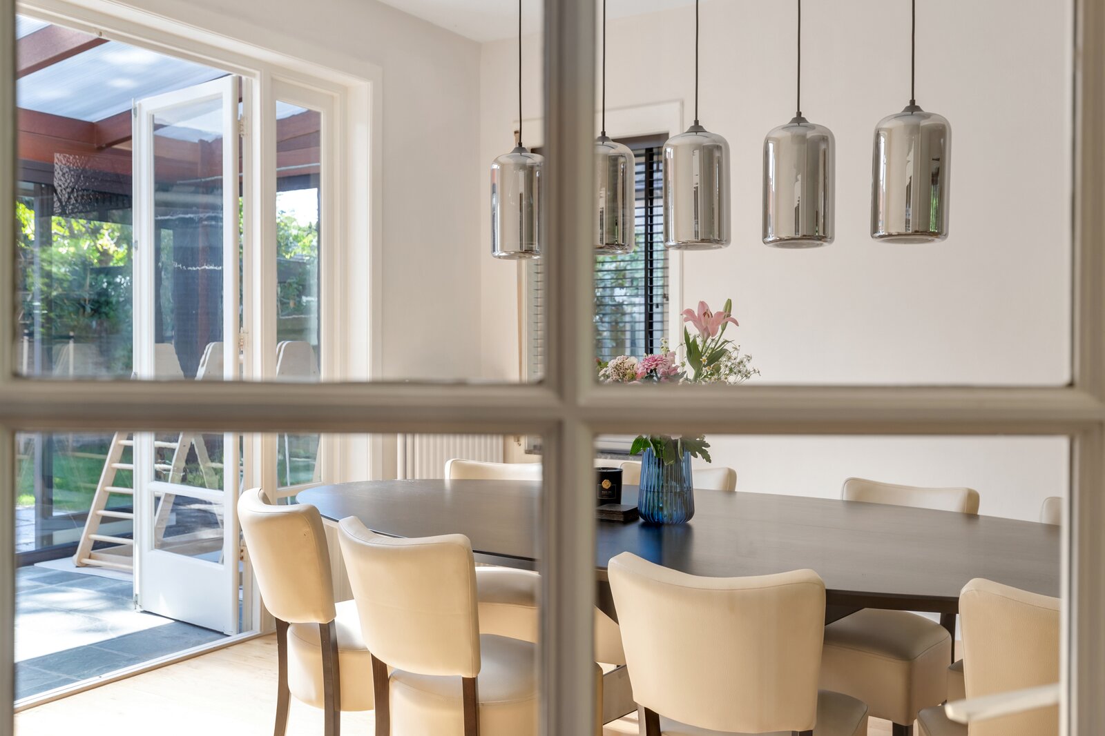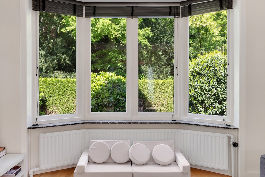 Entree met ruime hal, modern toilet en een werkkamer aan de voorzijde. De lichte woon-/eetkamer beschikt over hoge plafonds, een erker met een prachtig groen uitzicht en een sfeervolle open haard. Aan de achterzijde is een serre aanwezig. De gesloten keuken is voorzien van diverse inbouwapparatuur.