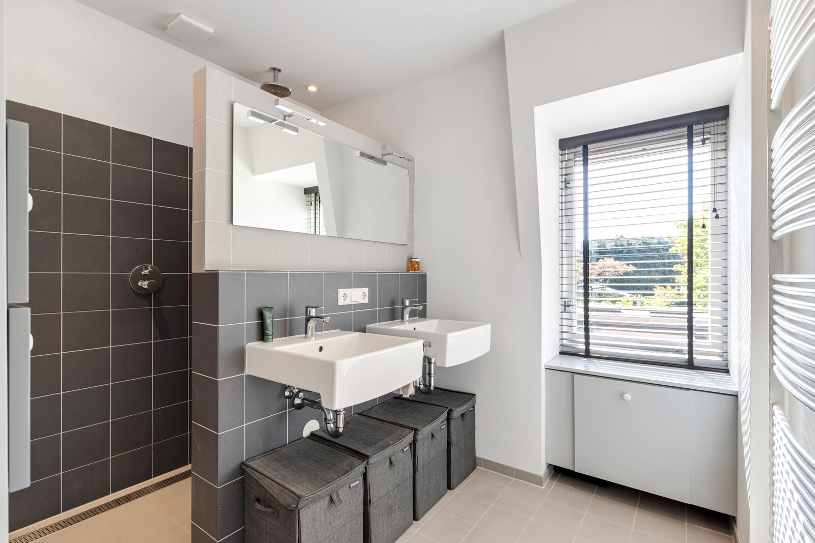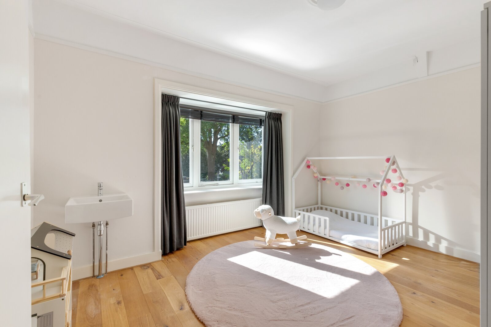 Op de verdieping bevinden zich twee riante slaapkamers, een kinderkamer, een ruime badkamer en een afzonderlijke toilet. De slaapkamers zijn voorzien van ruime linnenkasten en de badkamer is voorzien van een dubbele wastafel en een inloopdouche.