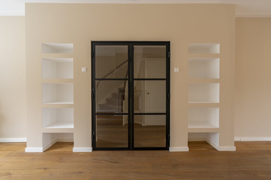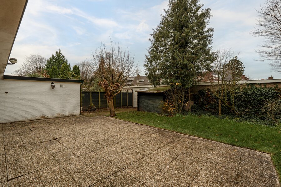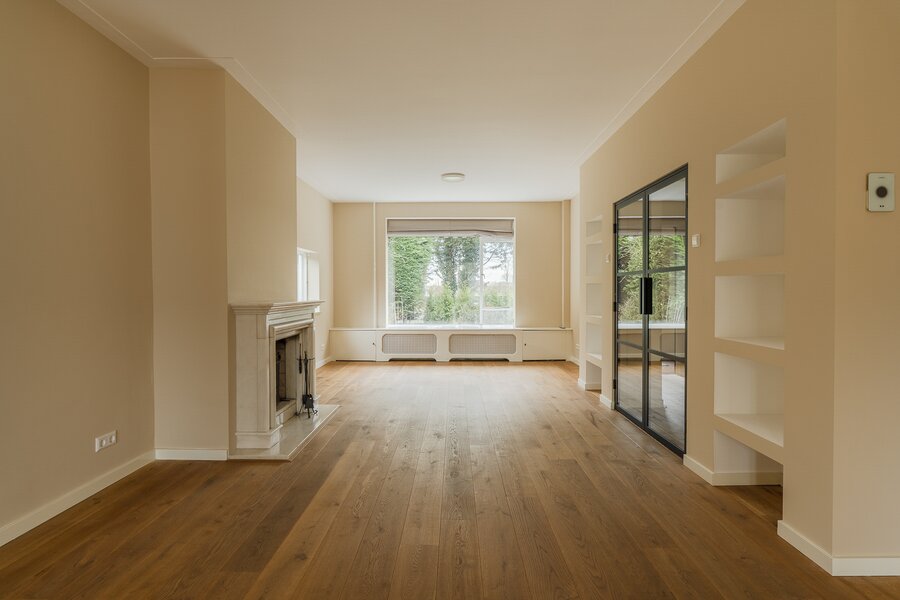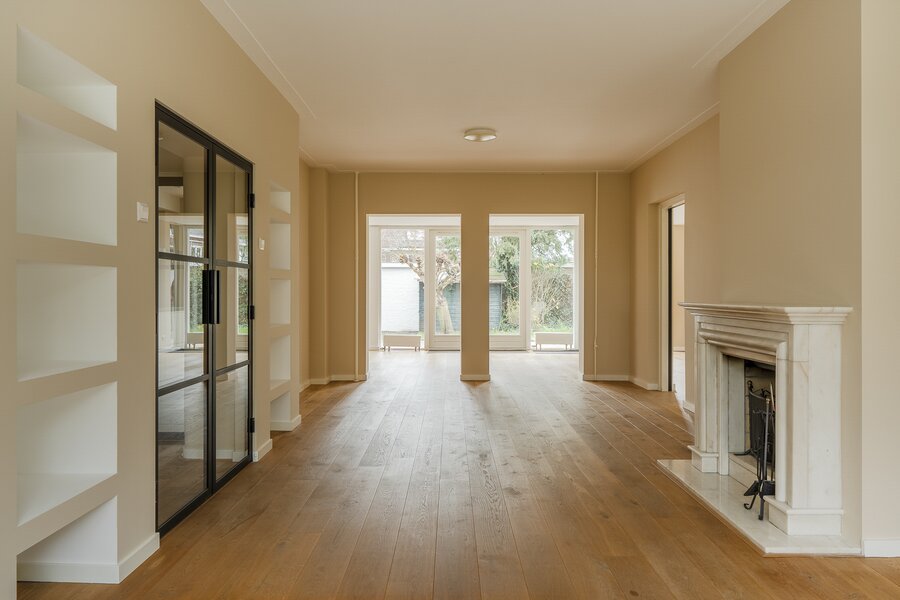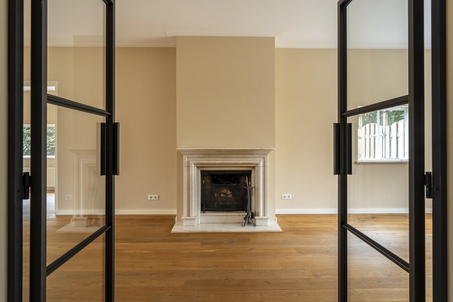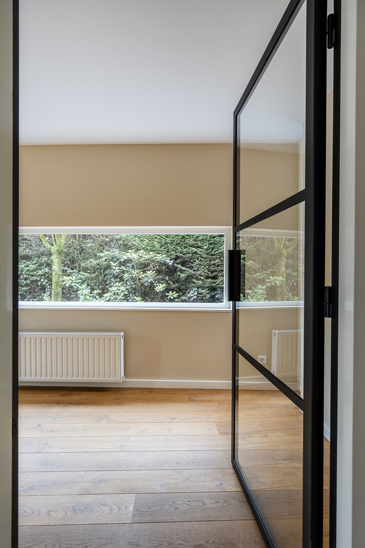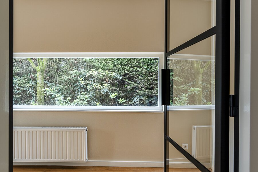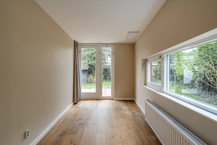 Entrance, spacious hall with a renovated guest toilet. Stylish steel doors lead into the bright and generously sized living/dining room with wooden floors, a fireplace, and French doors leading to the terrace and garden. The modern, semi-open kitchen has been renovated and is fully equipped. At the side of the house is a separate study, which can be closed off if desired. At the rear is a separate laundry room with additional storage space.