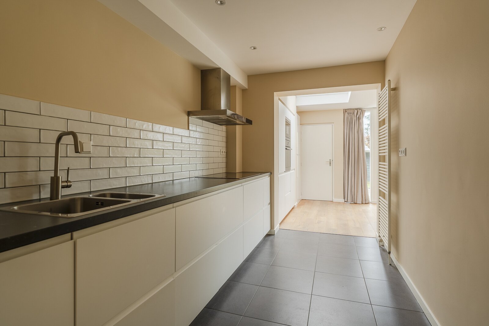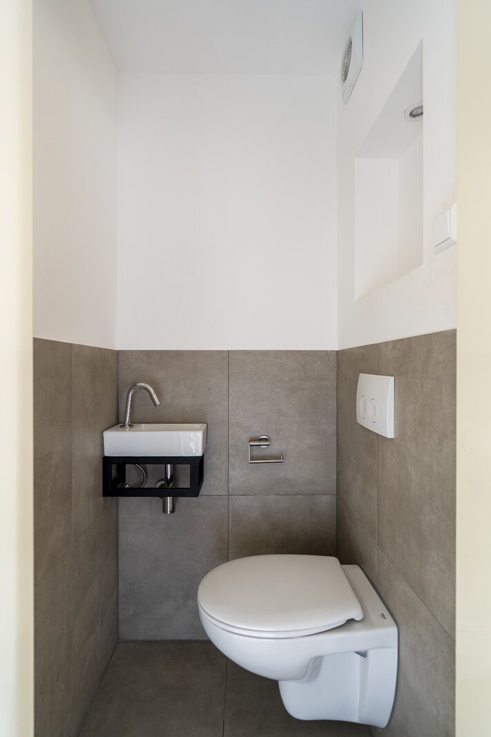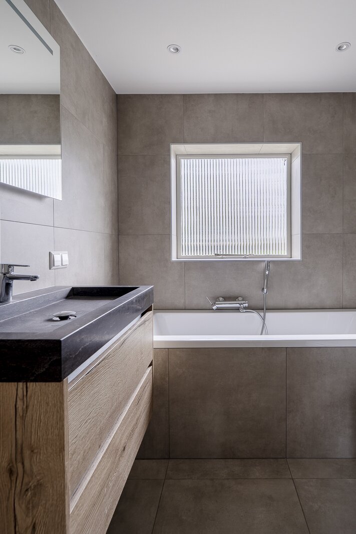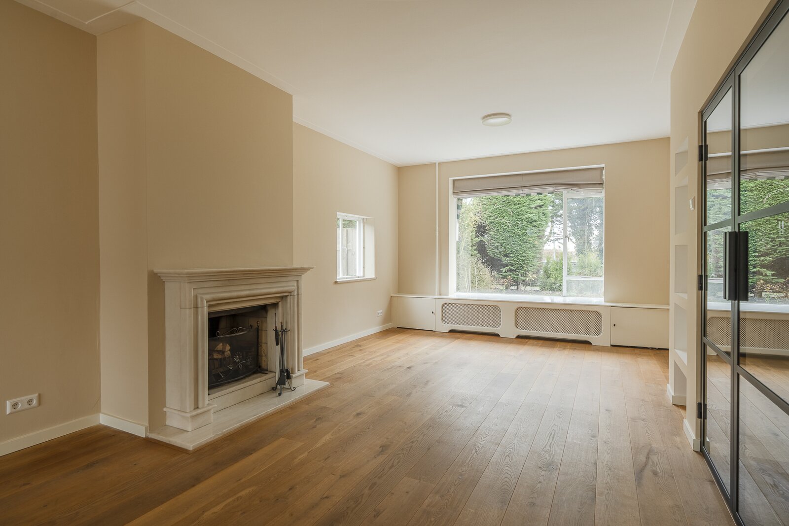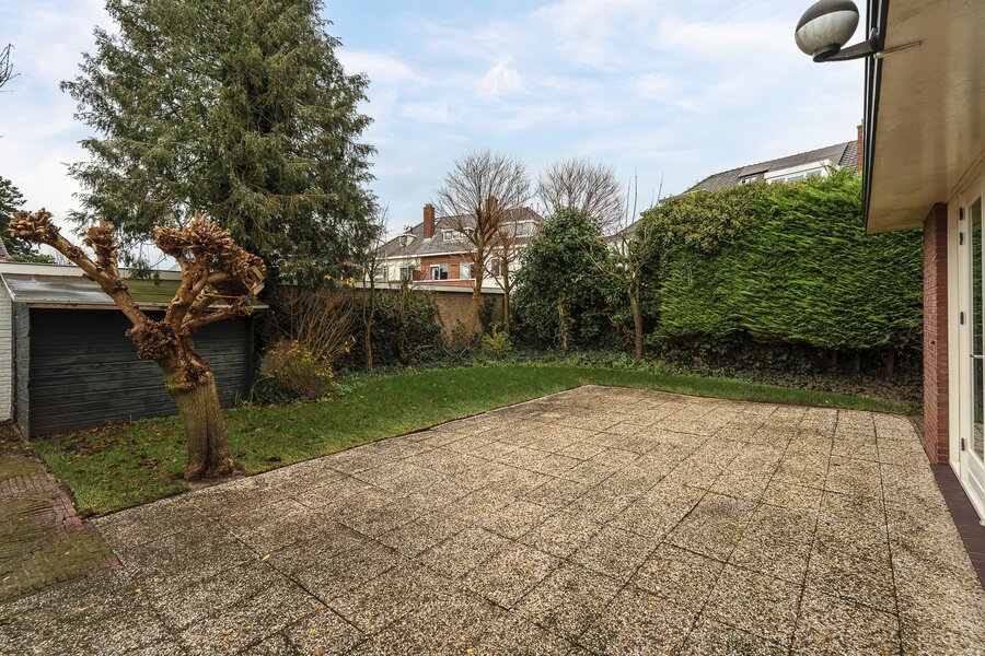 Entrance, spacious hall with a renovated guest toilet. Stylish steel doors lead into the bright and generously sized living/dining room with wooden floors, a fireplace, and French doors leading to the terrace and garden. The modern, semi-open kitchen has been renovated and is fully equipped. At the side of the house is a separate study, which can be closed off if desired. At the rear is a separate laundry room with additional storage space.