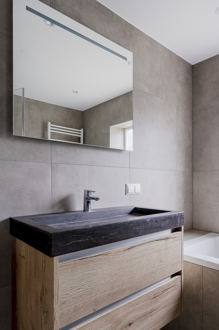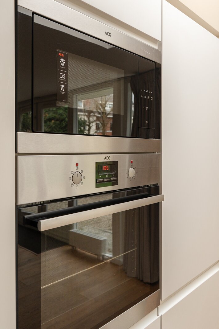 Entree, ruime hal met vernieuwd gastentoilet. Via stijlvolle stalen deuren bereikt u de lichte en royaal uitgebouwde woon-/eetkamer met houten vloeren, open haard en dubbele openslaande deuren naar het terras en de tuin. De moderne, halfopen keuken is recent vernieuwd en volledig uitgerust.