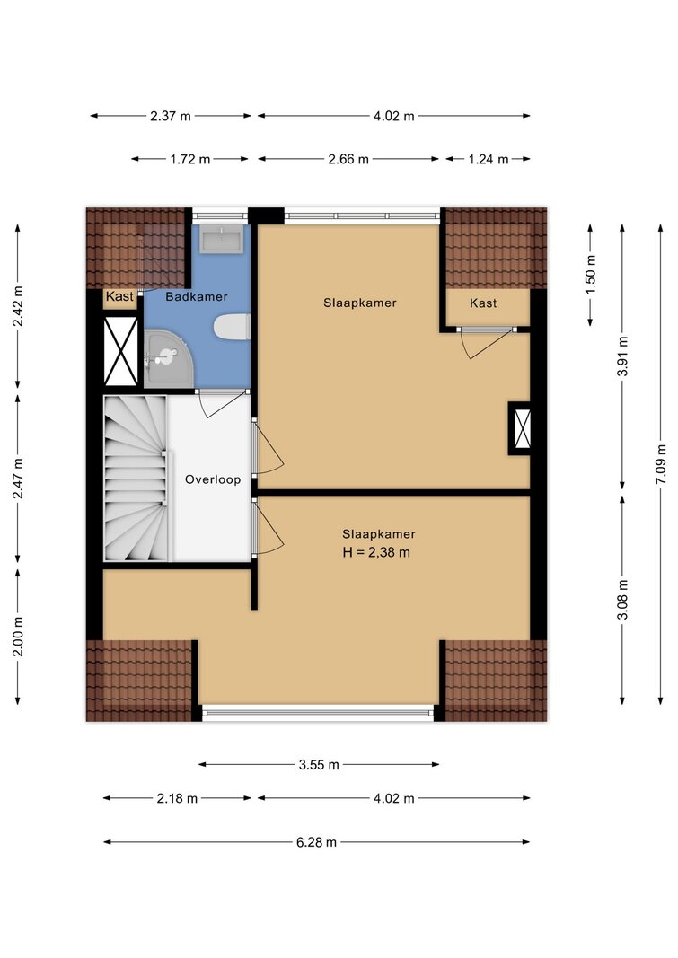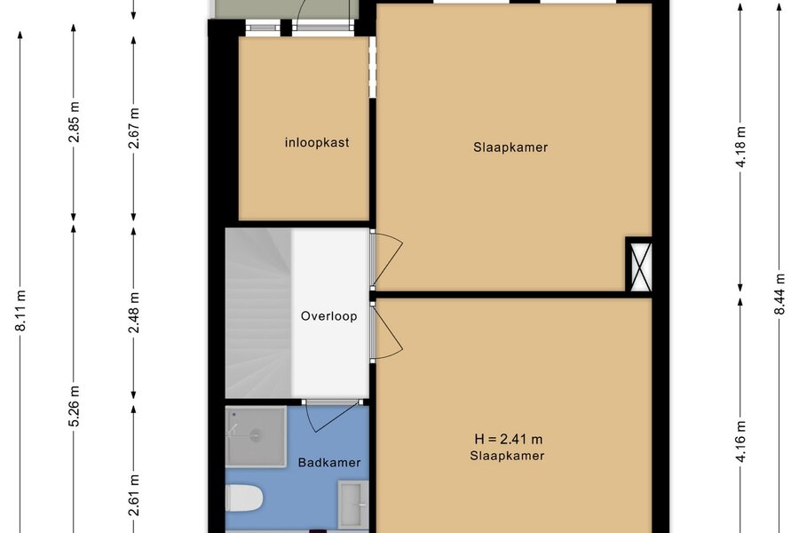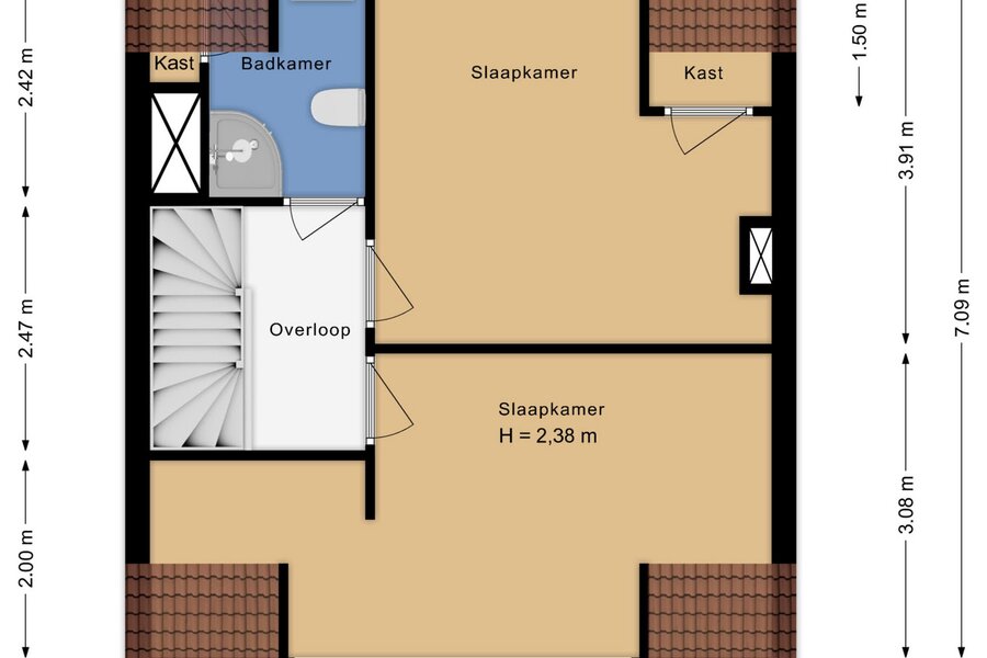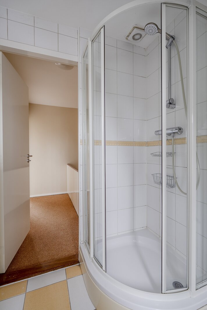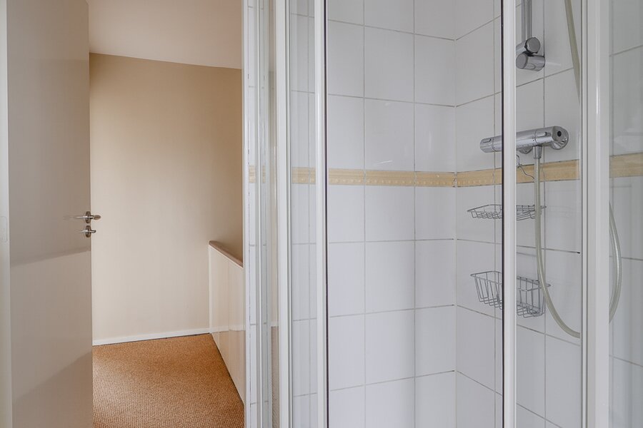 Overloop. Twee goed bemeten slaapkamers met bergruimte. Tweede badkamer met douche en toilet.