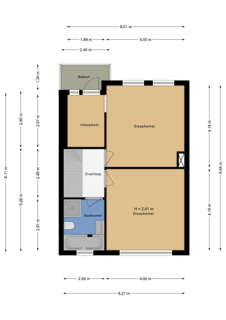 Landing. Spacious master bedroom at the rear with a walk-in closet and adjoining balcony (formerly a bedroom). Large bedroom at the front. Renovated, modern bathroom with a shower, bathtub, toilet, and underfloor heating.
