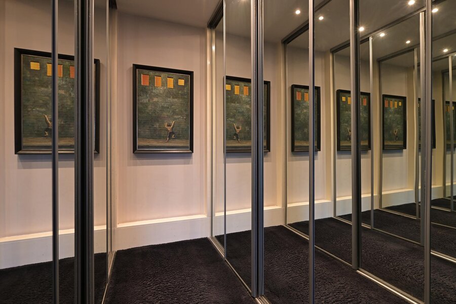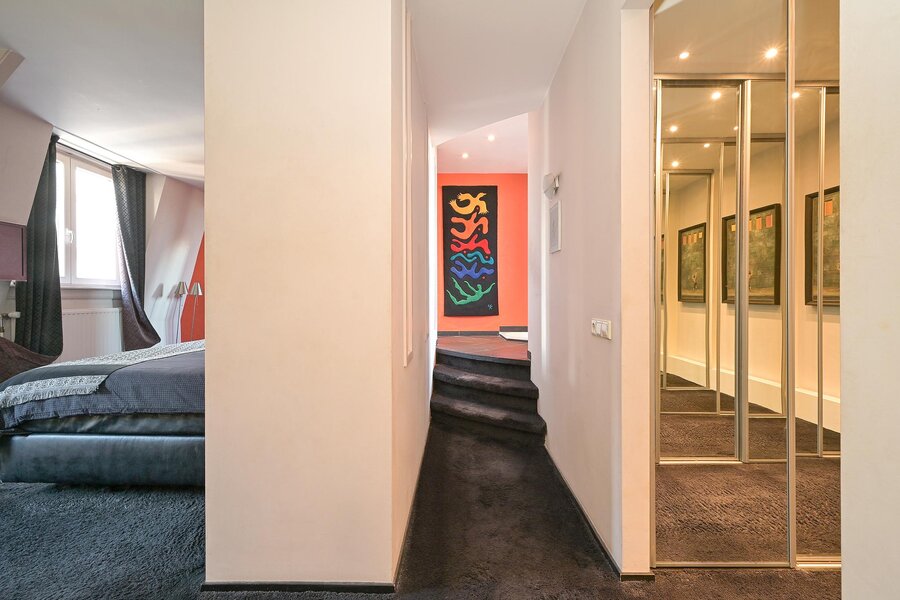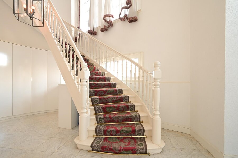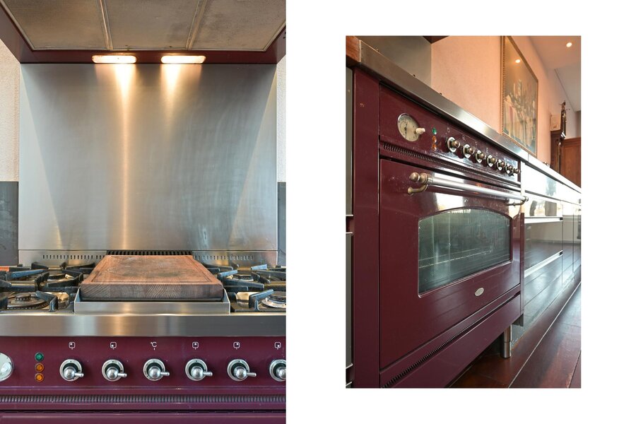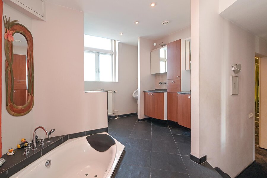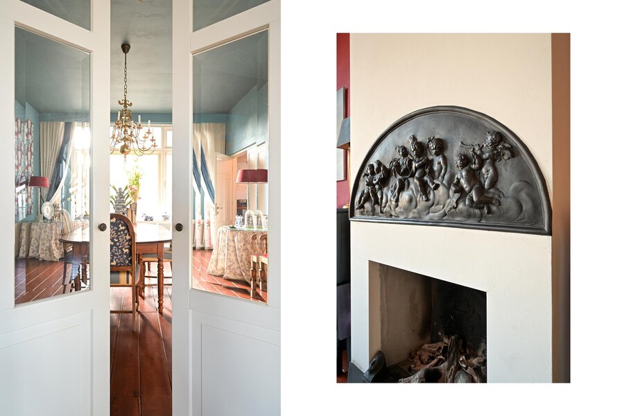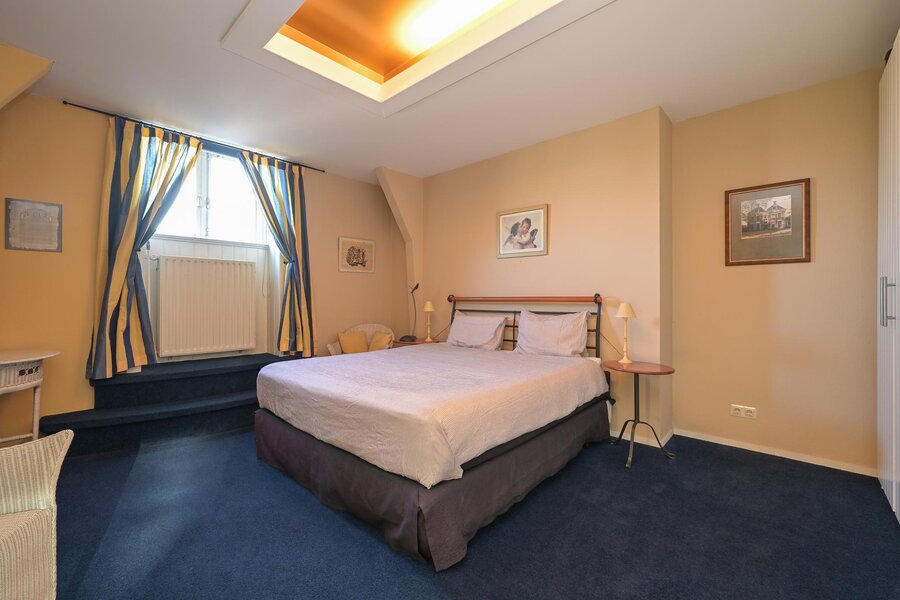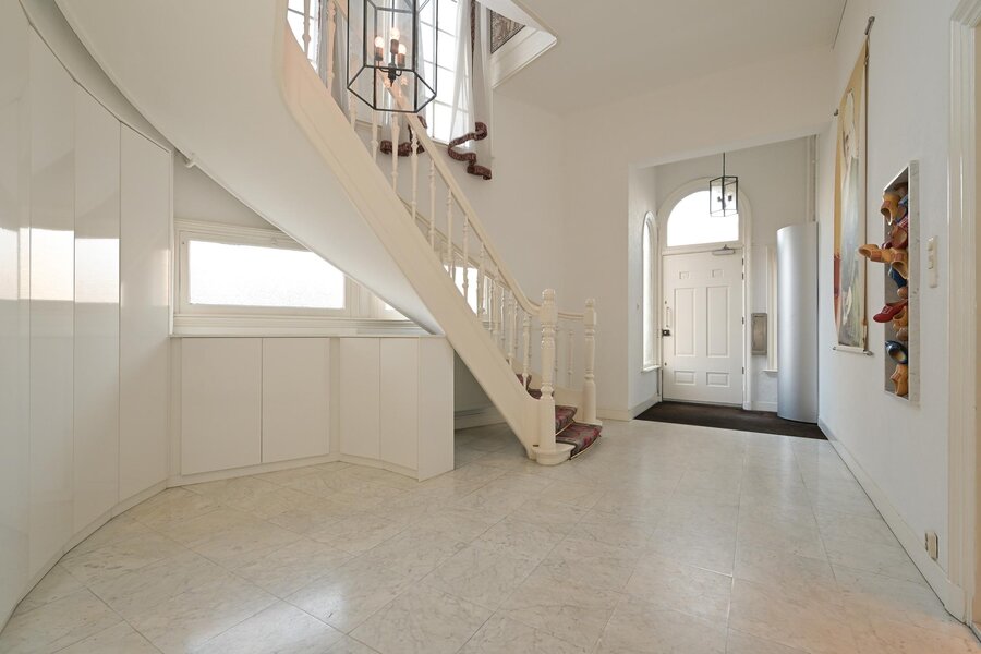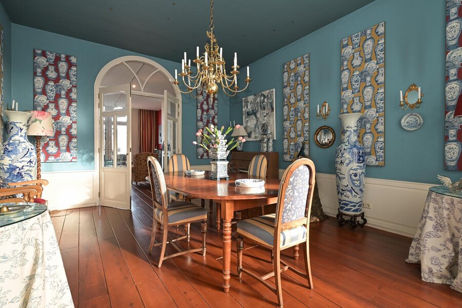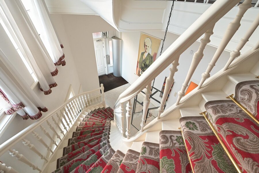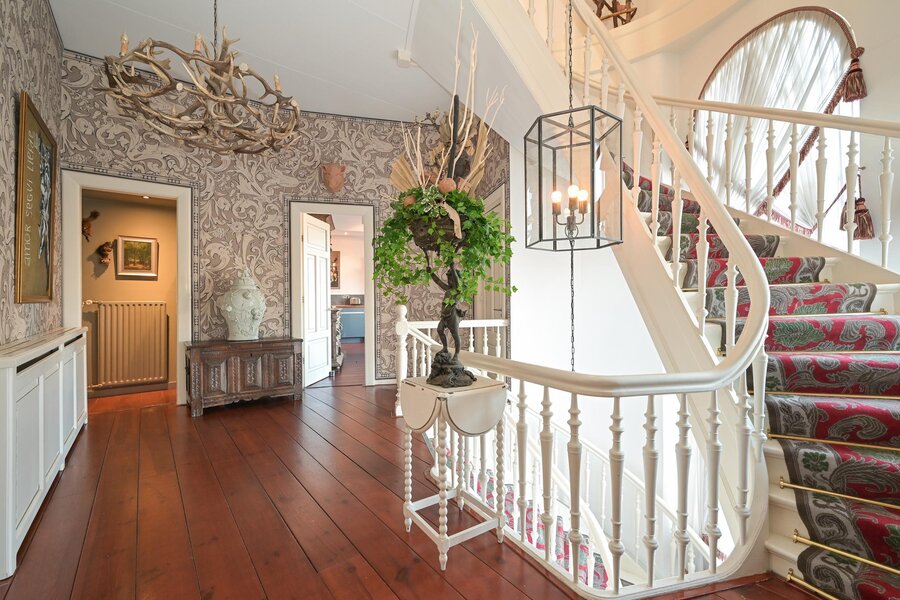 royale overloop met indrukwekkend trappenhuis, w.c. met fontein. Vanuit overloop dubbele deuren naar woonkamer met open haard en openslaande deuren naar balkon. Torenkamer aan de voorzijde. De eetkamer is vanuit de woonkamer en de tweede hal bereikbaar. Aparte bijkeuken. Royale woonkeuken met diverse inbouwapparatuur en openslaande deuren naar het achterbalkon.