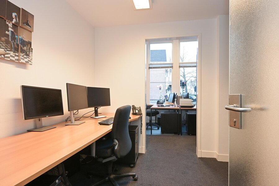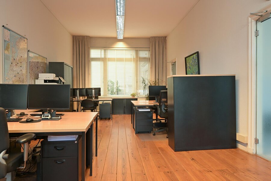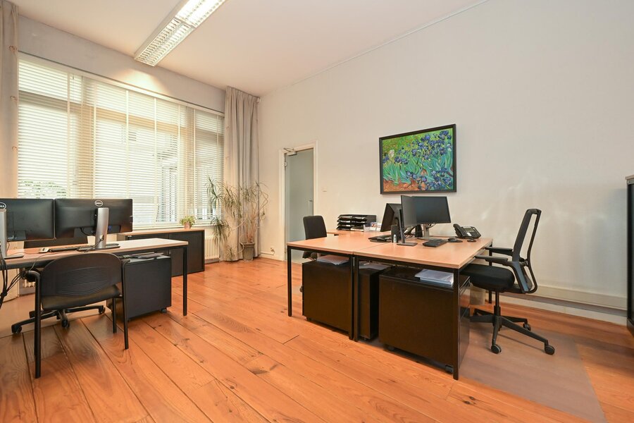 statige ontvangsthal, meterkast, twee w.c.'s met fontein, hal, riante kantoorruimte en separaat 3 aparte vergader-/werkruimtes, dichte keuken met deur naar achtertuin met achterom.