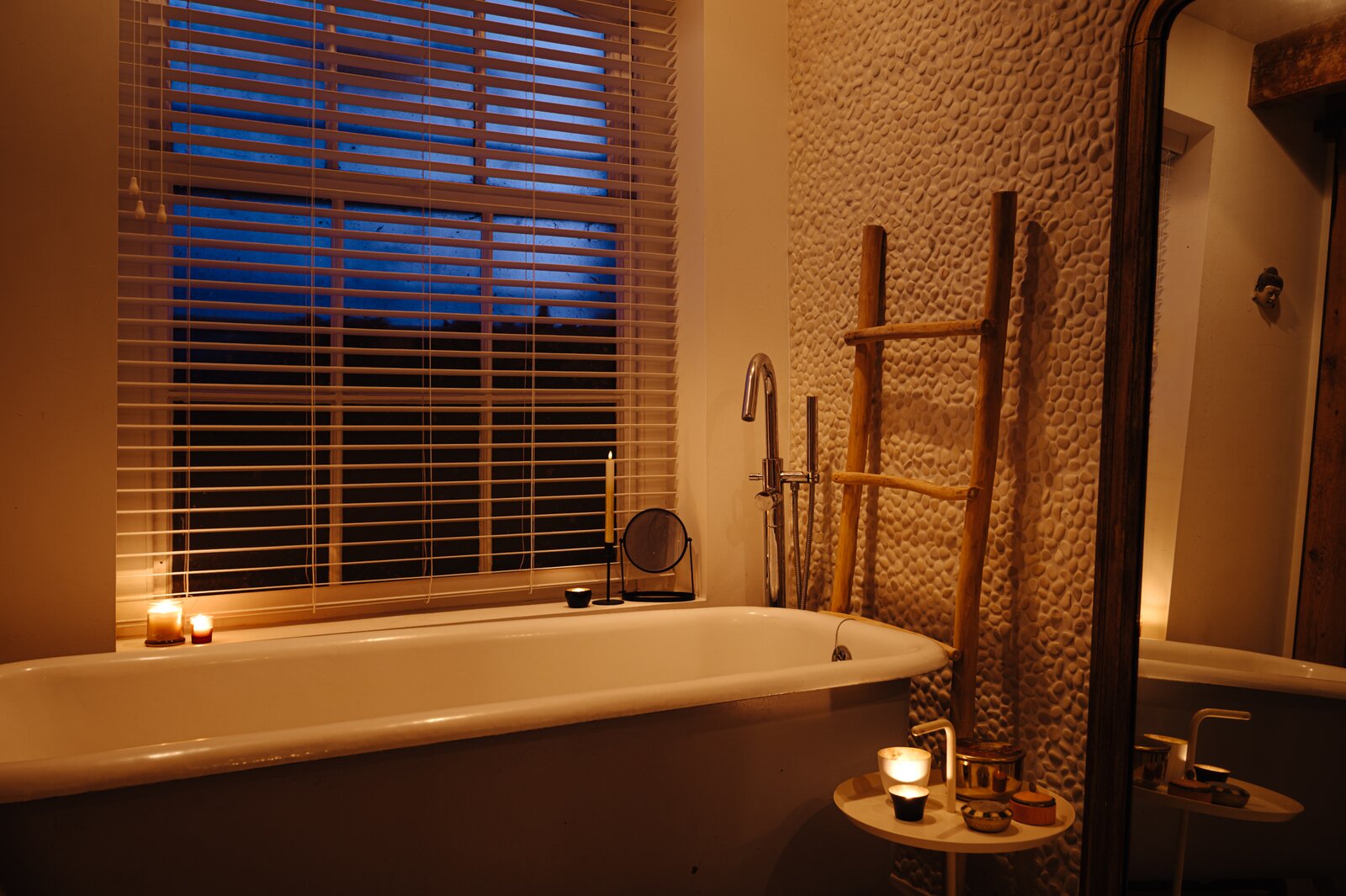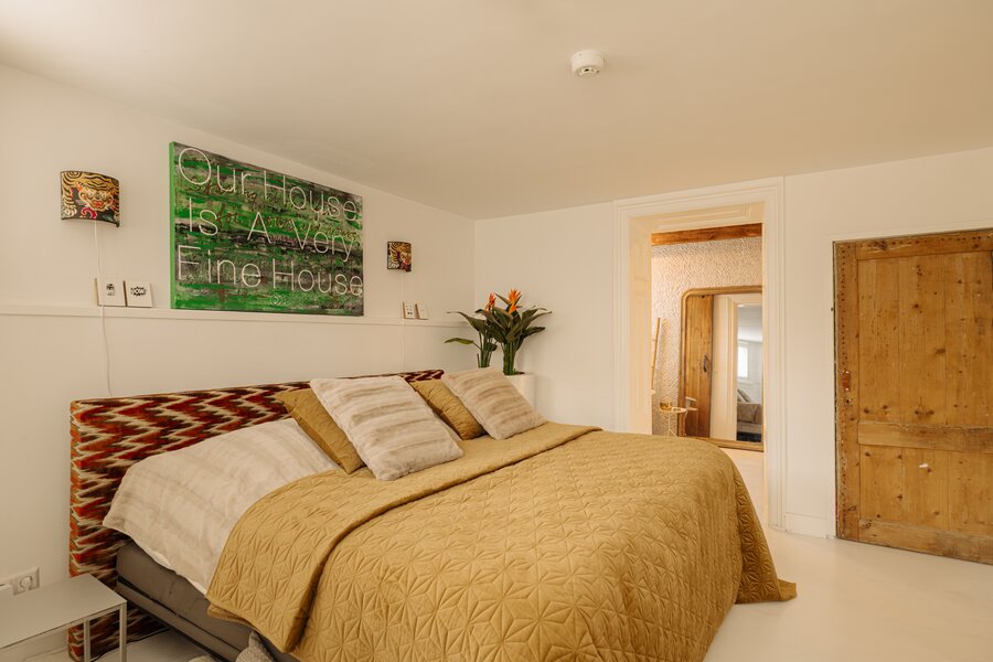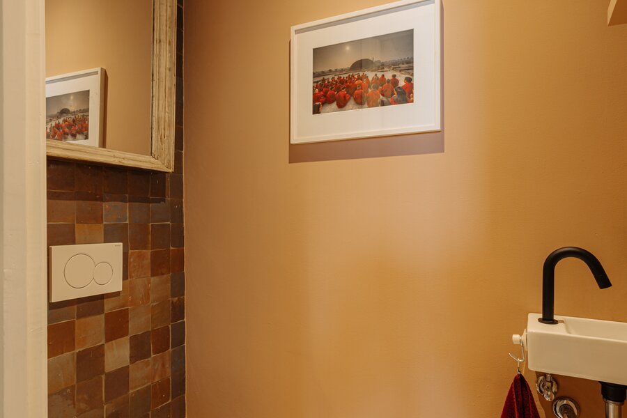 De master bedroom ligt aan de voorzijde en beschikt over een en-suite badkamer met een vrijstaand ligbad op pootjes, wastafelmeubel, kastruimte en een royale inloopdouche. Aangrenzend bevindt zich een tweede kamer, ideaal als logeer- of werkkamer. De royale derde slaapkamer aan de achterzijde heeft directe toegang tot de tuin. De tweede badkamer is sfeervol uitgevoerd met een op maat gemaakte zwarte stalen douchecabine met regendouche, handgemaakte Marokkaanse zelliges tegels, een robuust houten meubel met betonnen wastafel en een zwevend toilet.