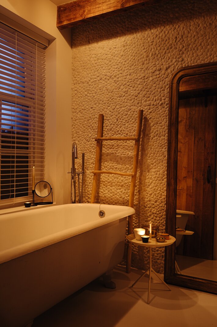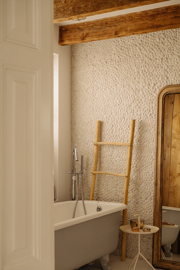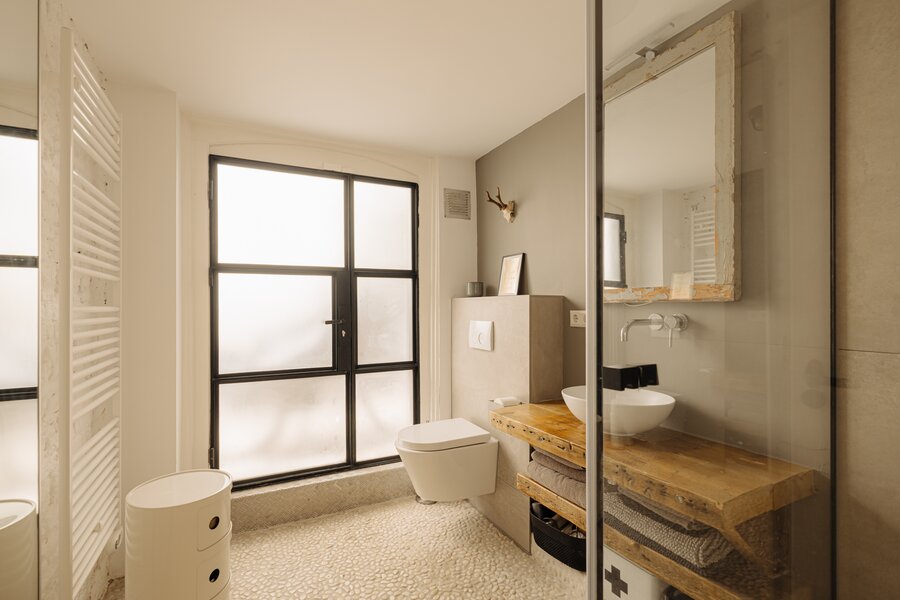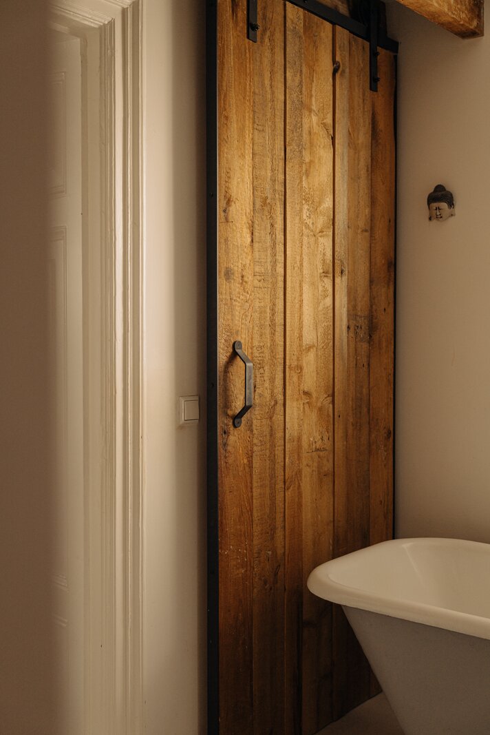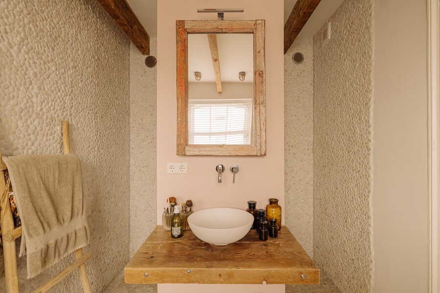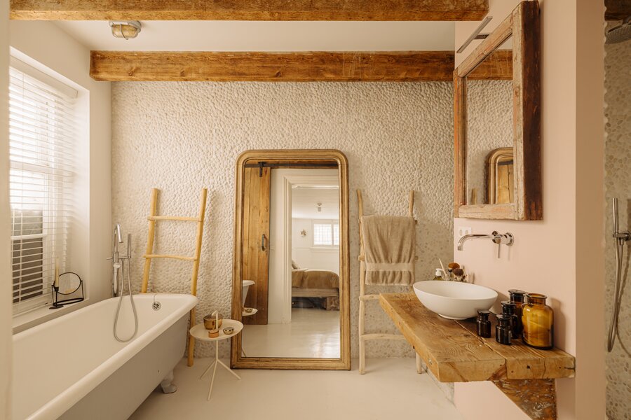 The master bedroom is located at the front and includes an en-suite bathroom with a freestanding claw-foot bathtub, vanity unit, built-in storage and a spacious walk-in shower. Adjacent is a second room, perfectly suited as a guest bedroom or home office. The generous third bedroom at the rear offers direct access to the garden. The second bathroom is beautifully styled, featuring a custom black steel shower enclosure with rain shower, handcrafted Moroccan zellige tiles, a solid wooden vanity with concrete washbasin, and a wall-hung toilet.