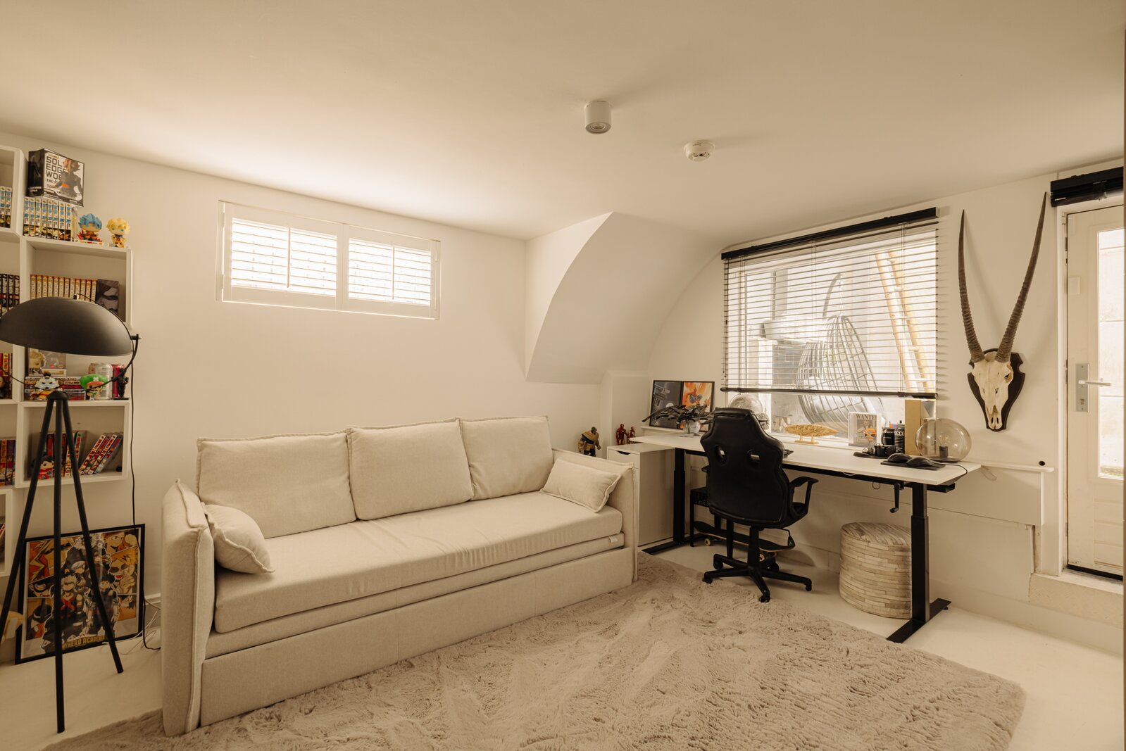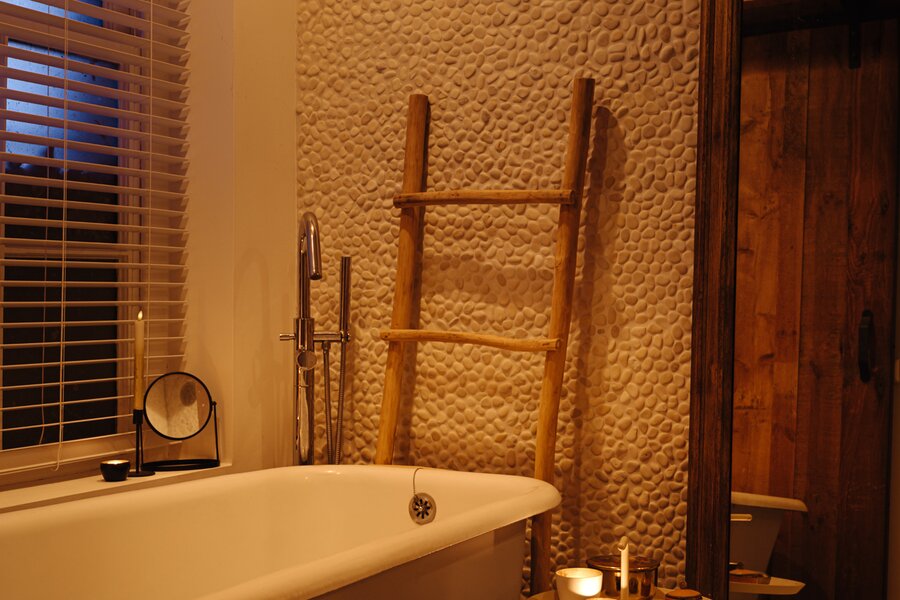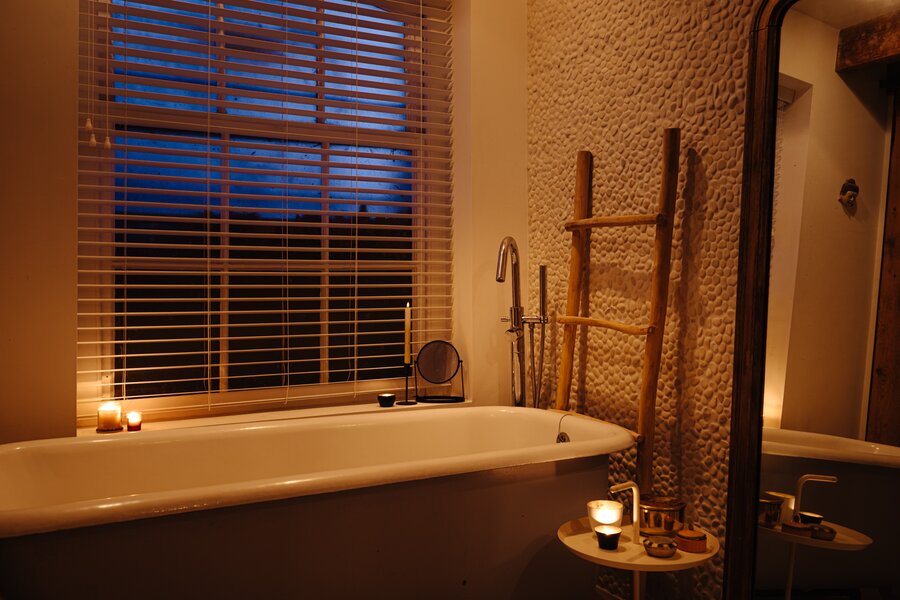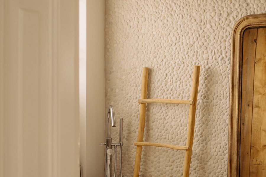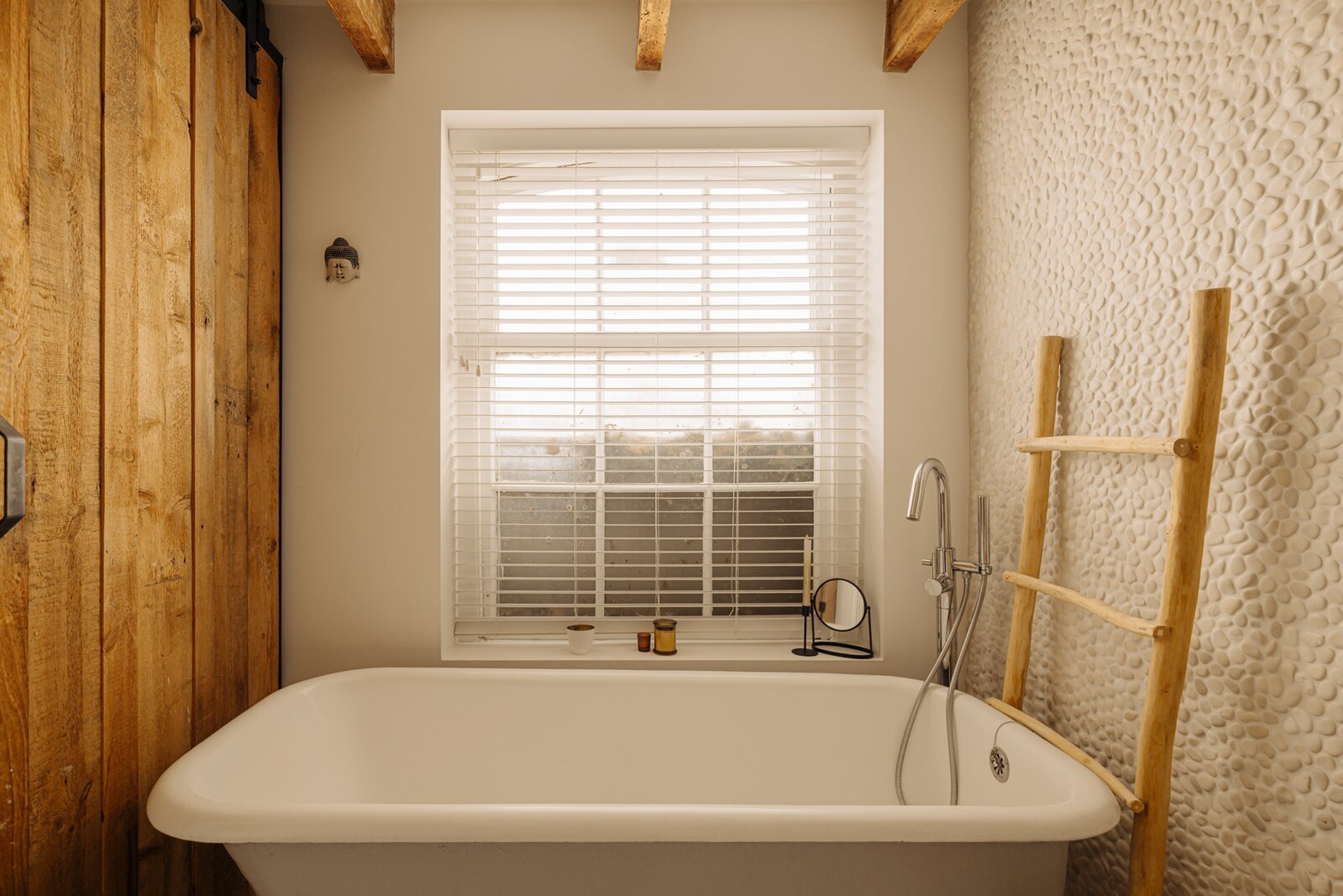 The master bedroom is located at the front and includes an en-suite bathroom with a freestanding claw-foot bathtub, vanity unit, built-in storage and a spacious walk-in shower. Adjacent is a second room, perfectly suited as a guest bedroom or home office. The generous third bedroom at the rear offers direct access to the garden. The second bathroom is beautifully styled, featuring a custom black steel shower enclosure with rain shower, handcrafted Moroccan zellige tiles, a solid wooden vanity with concrete washbasin, and a wall-hung toilet.