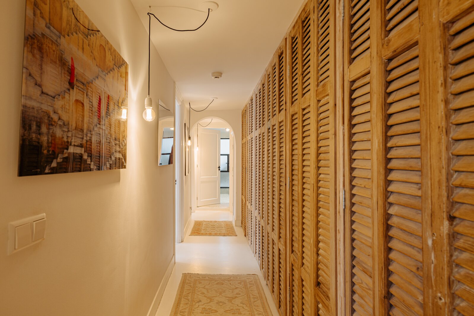 The lower level comprises three bedrooms, two full bathrooms, and a separate, practical laundry room. A standout feature is the long hallway fitted with bespoke built-in wardrobes with unique louvred doors, combining striking aesthetics with exceptional functionality.