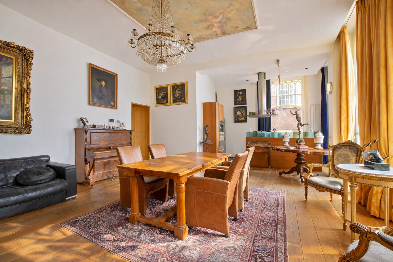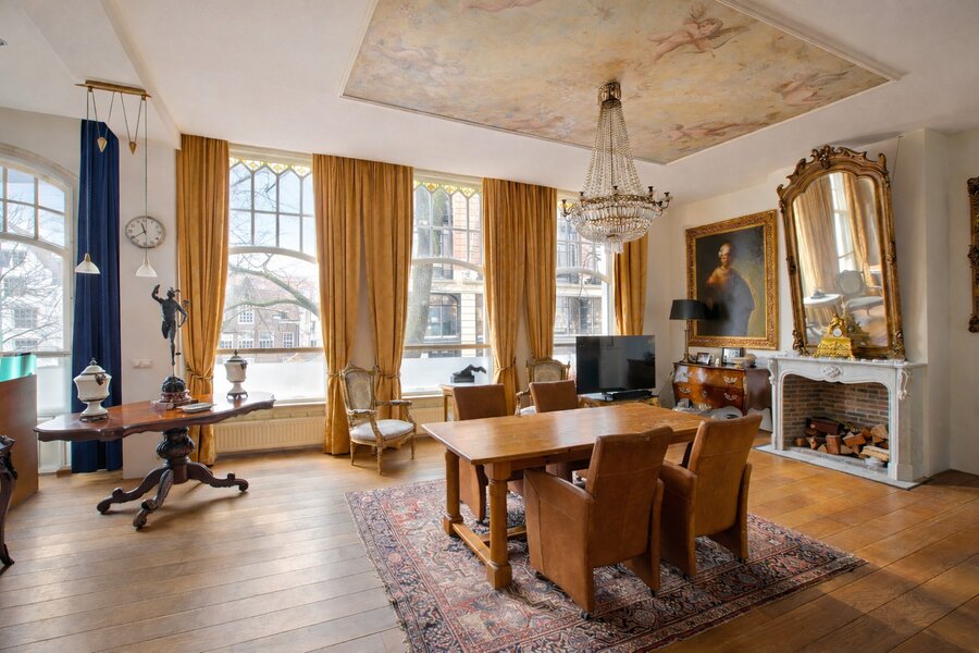 The living room at the front of the apartment is remarkably bright thanks to its high ceilings and large windows. These windows offer expansive and distinctive views of the Spui canal and the Beguinage tower, impressively bringing the historic cityscape indoors.