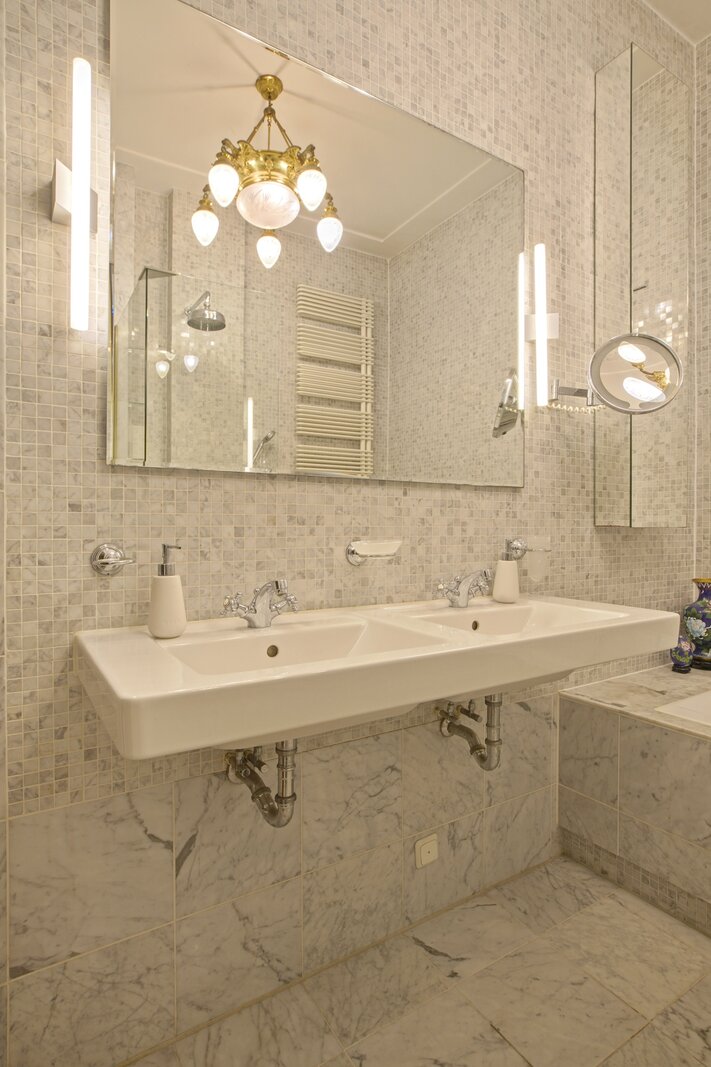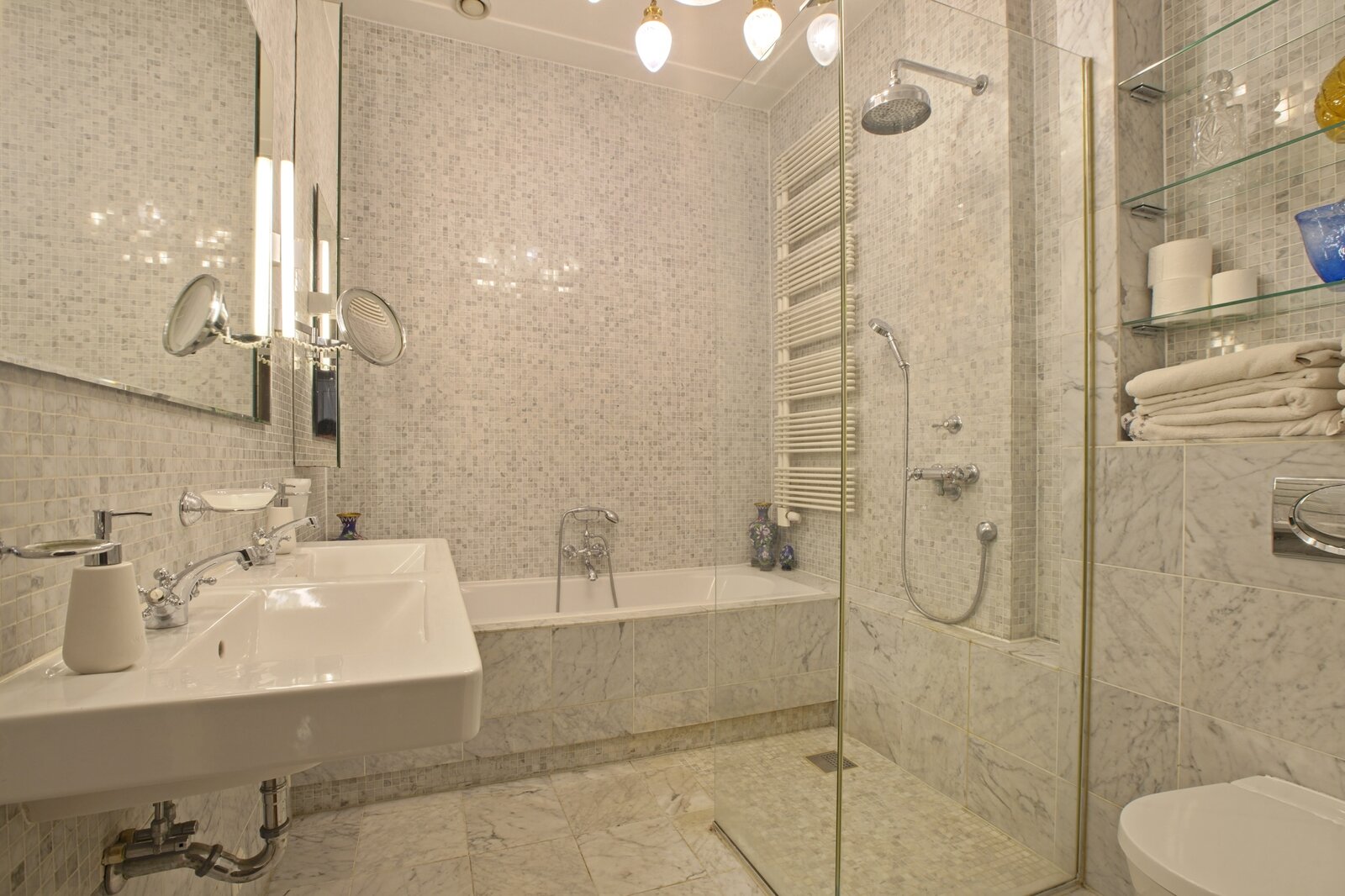 The spacious bathroom, finished in white Drama marble, is centrally located in the apartment and features a walk-in shower, bathtub, toilet, and double sink. A stylish space with a luxurious feeling.