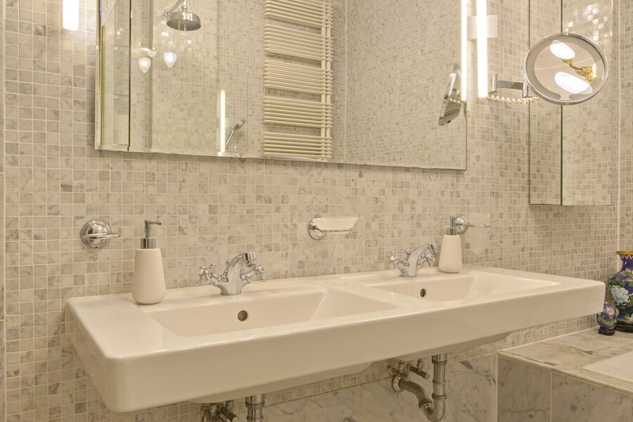 Centraal in het appartement bevindt zich de ruime badkamer, uitgevoerd in white drama marble, met een inloopdouche, ligbad, toilet en dubbele wastafel. Een stijlvolle ruimte met een luxueuze uitstraling.