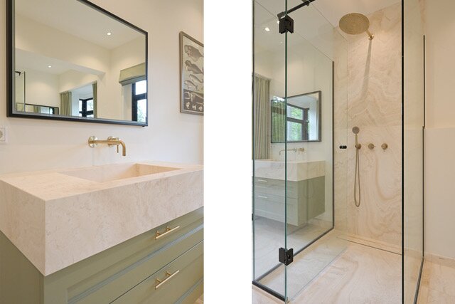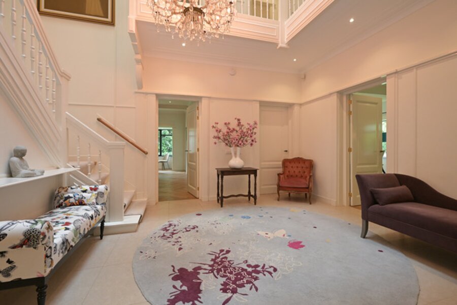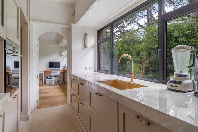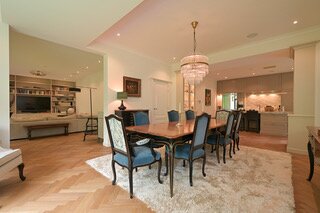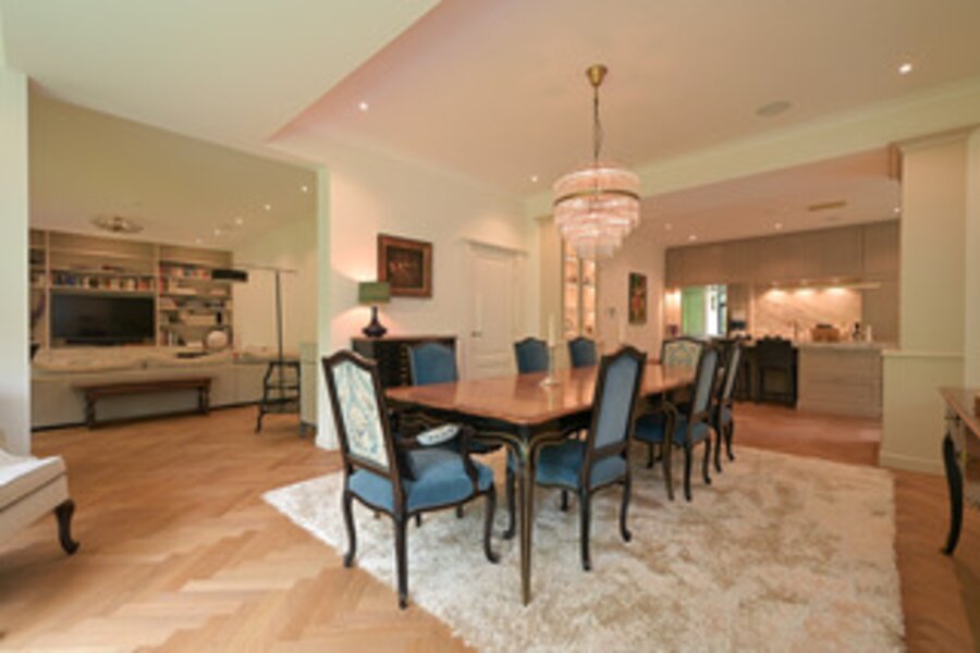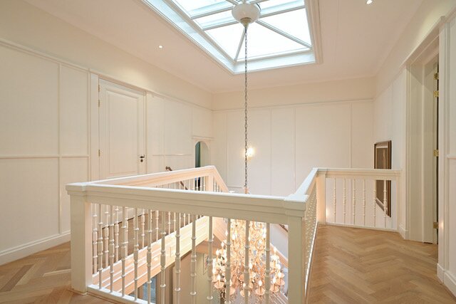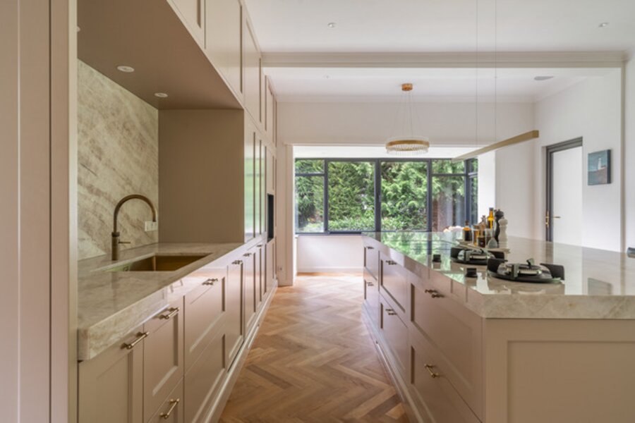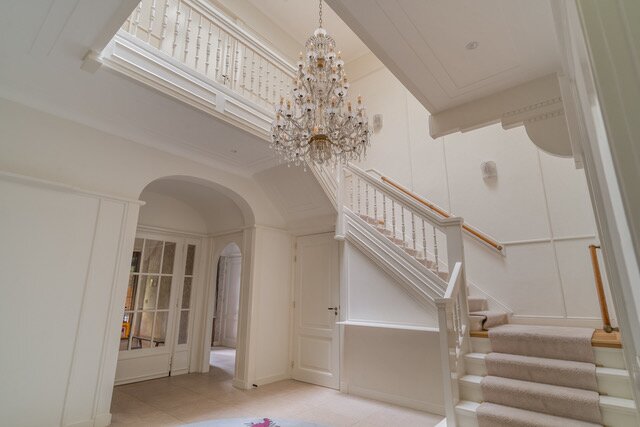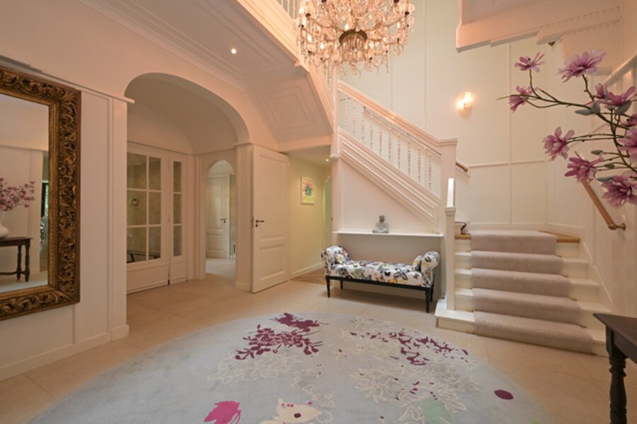 Indeling: Entree, vestibule, complete garderobe met sanitair, zeer fraaie, hal met omlopend trappenhuis, vides met daglicht uit het dak, moderne complete woonkeuken/eetkamer ensuite living, aparte serre, chef's kitchen met dubbele apparatuur, bijkeuken, laundry, inpandig gastenverblijf bestaande uit zit/slaapkamer met openslaande deuren naar de tuin, complete moderne badkamer, eigen entree.