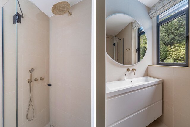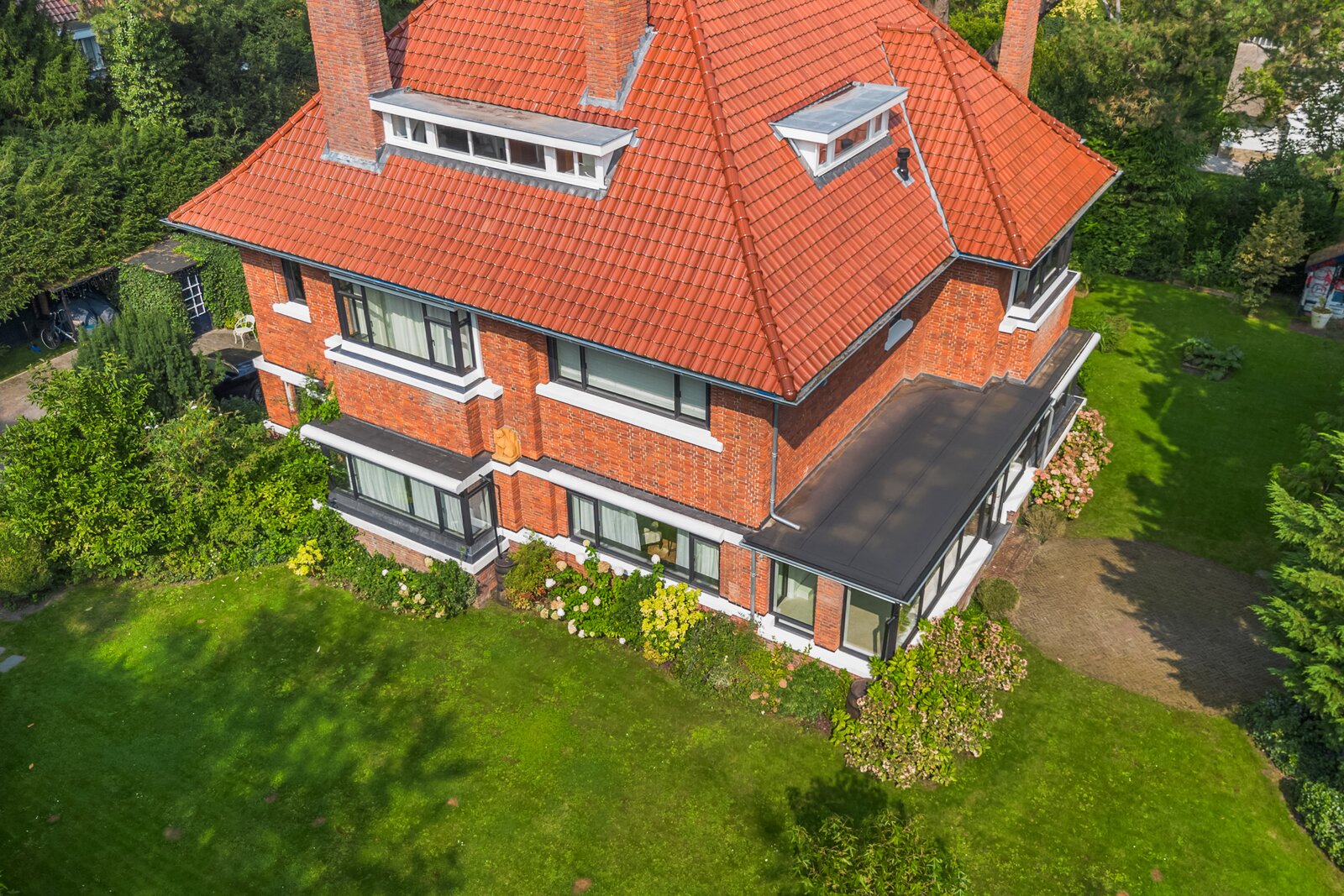 The garden is elegant landscaped, measuring approximately 1,732 m2 in total, equipped with terraces, driveway, security and heated swimming pool with outdoor shower.