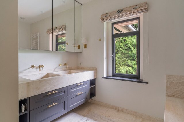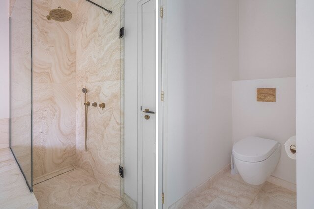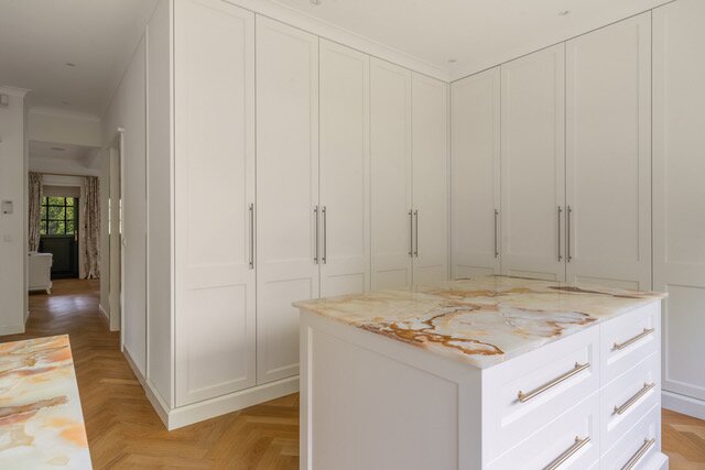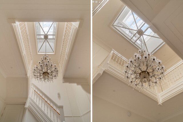 1st Floor: The spectacular staircase with beautiful landing, suite consisting of a large bedroom, complete modern bathroom, dressing room, walk-in closet, loggia, 2nd large bedroom with ensuite large complete modern bathroom, loggia, 3rd large bedroom with hidden in- closet feature (ladder to upper room), separate toilet.