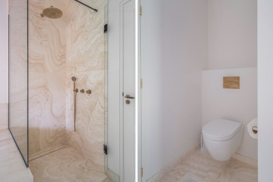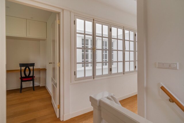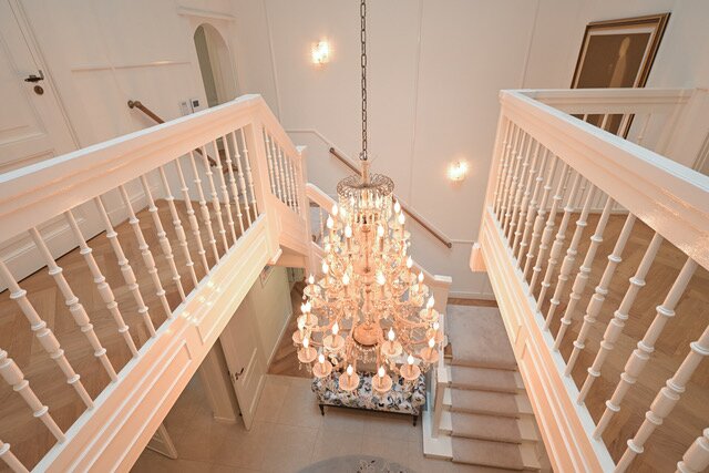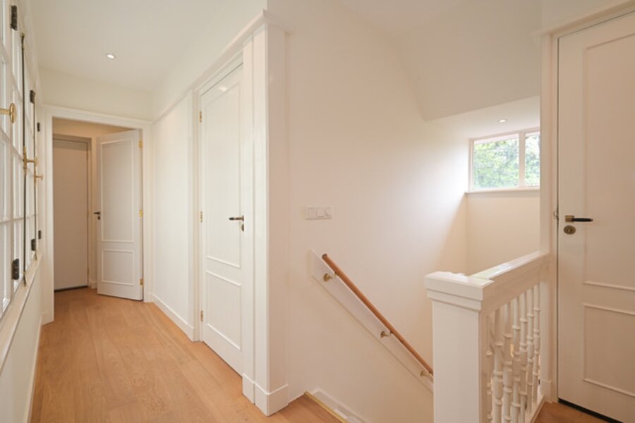 1e Verdieping: Het met licht overgoten trappenhuis, de mooie overloop, master suite bestaande uit een grote slaapkamer, complete moderne badkamer, kleedkamer, walk-in-closet, loggia, 2e grote slaapkamer met ensuite grote complete moderne badkamer, loggia, 3e grote slaapkamer met verborgen in-closet feature (ladder naar bovengelegen kamer), apart toilet.