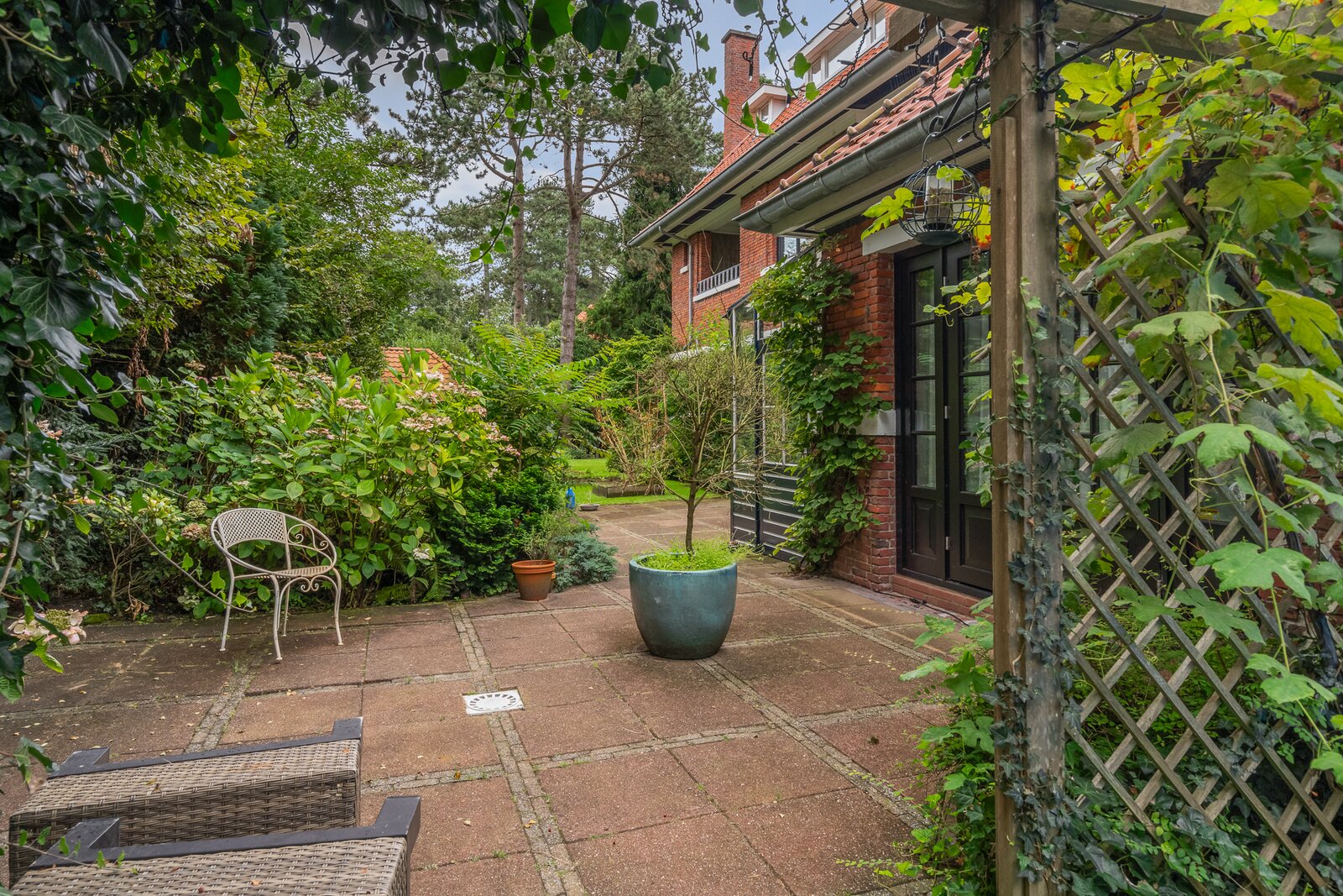 De tuin is elegant aangelegd, totaal circa 1.732 m2 groot, voorzien van terrassen, oprit, beveiliging en verwarmd zwembad met buitendouche.