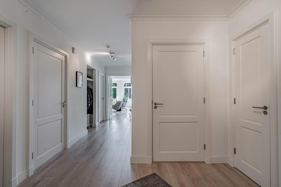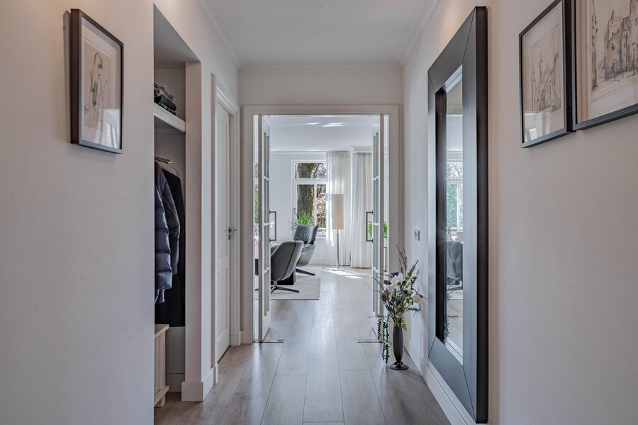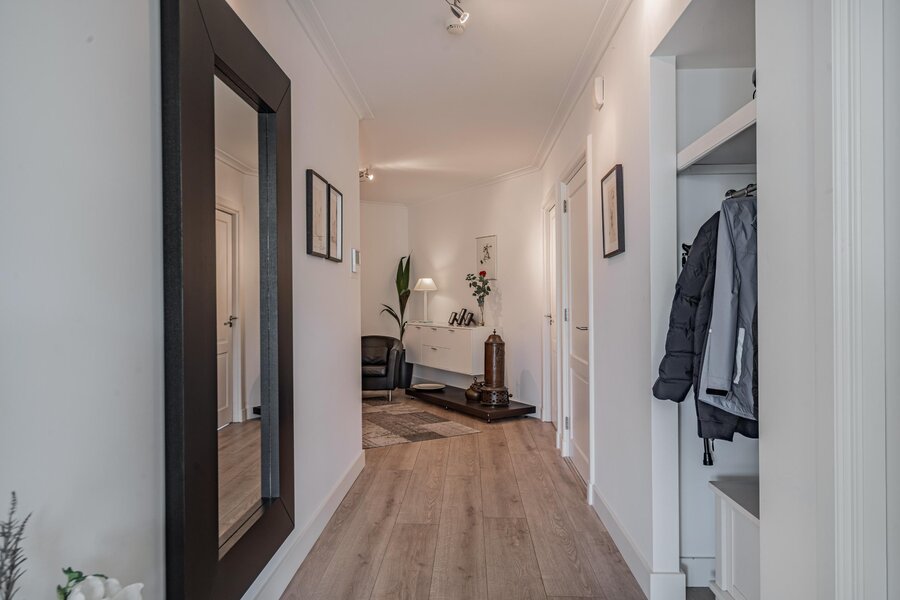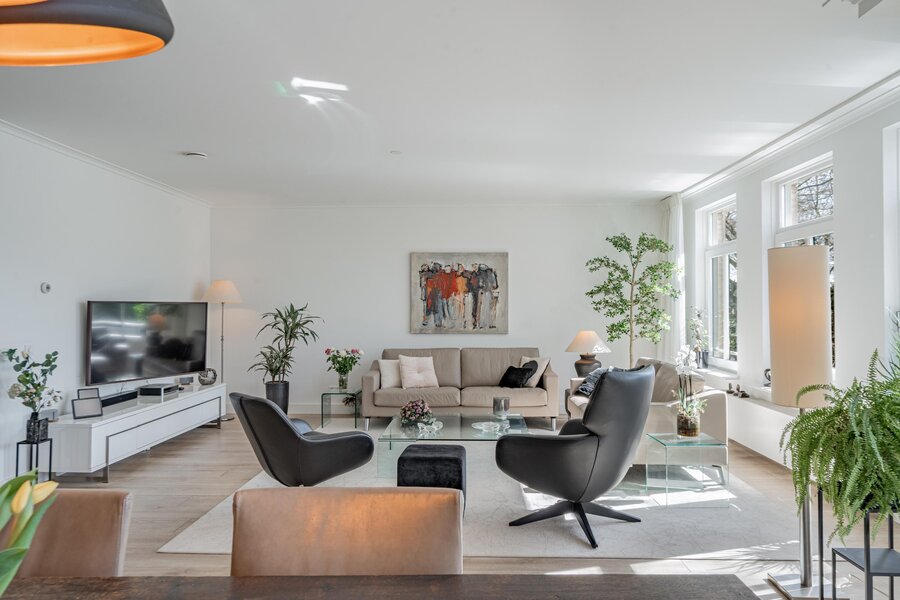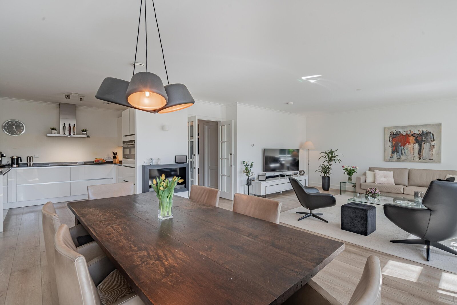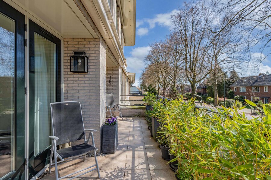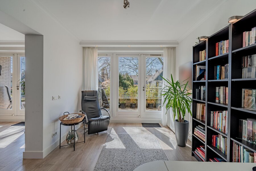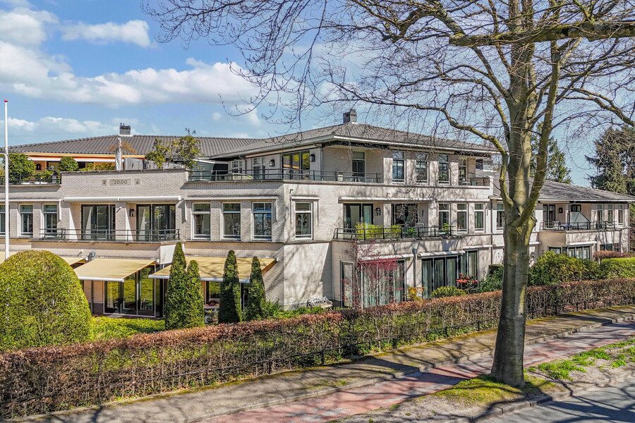 Indeling: entree, ruime hal, garderobe, marmeren vrijhangend toilet, kleedkamer, royale hoofdslaapkamer met toegang tot luxe marmeren badkamer met ligbad, separate douche, vrijhangend toilet, dubbel wastafelmeubel en vloerverwarming, ruime 2e werk-/slaapkamer met openslaande deuren naar het terras op het zuiden grenzend aan de woonkamer, vanuit de hal wordt door openslaande deuren met roedeverdeling de royale living bereikt, deze living heeft een praktische en gezellige erker en beschikt over openslaande deuren naar het grote zonnige terras op het zuiden, de ruime keuken uit 2017 is voorzien van veel luxe zoals granieten werkblad, Quooker, hete lucht oven, combi oven, koelkast, vaatwasser, elektrische kookplaat en afzuigkap. In het appartement bevindt zich tevens nog een ruime inpandige berging met onder andere aansluiting voor wasapparatuur, CV Ketel en een separate vriezer.