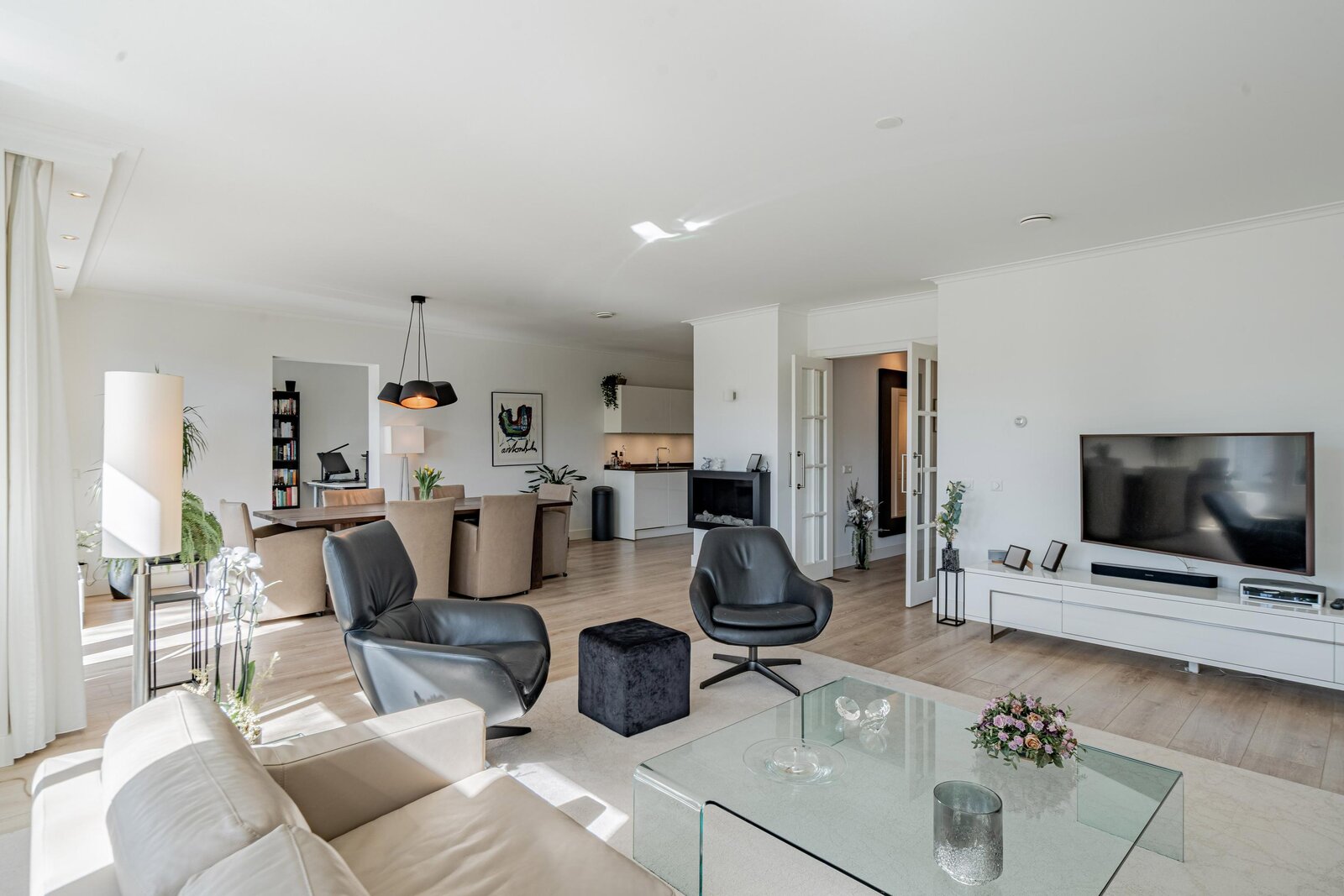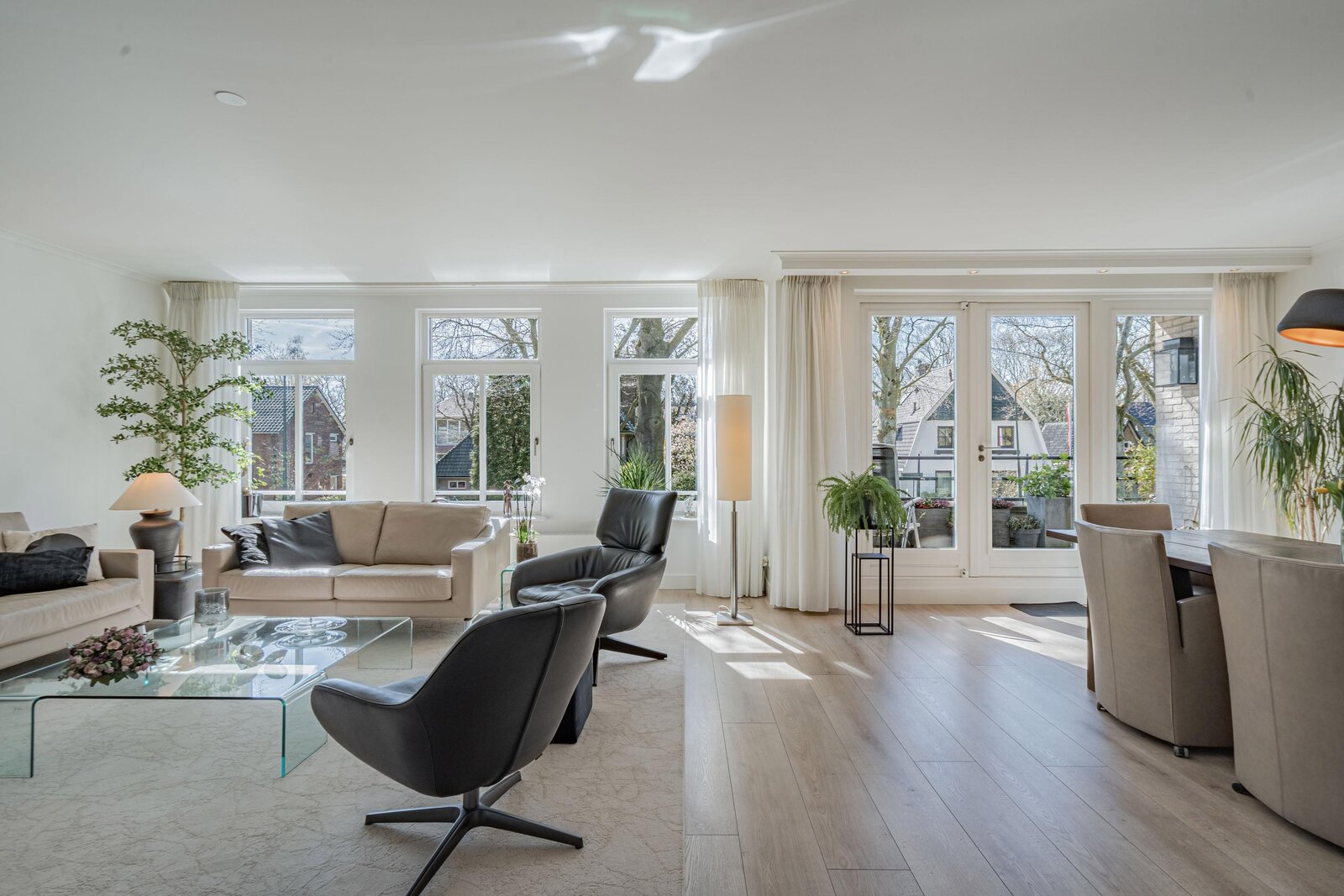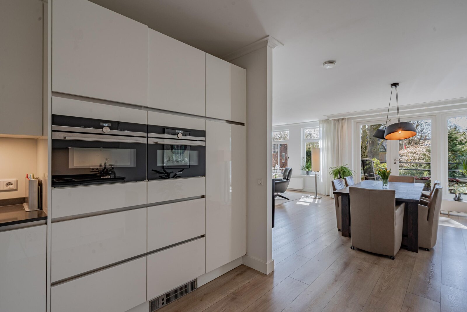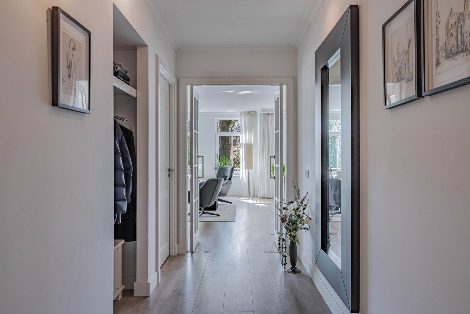 Indeling: entree, ruime hal, garderobe, marmeren vrijhangend toilet, kleedkamer, royale hoofdslaapkamer met toegang tot luxe marmeren badkamer met ligbad, separate douche, vrijhangend toilet, dubbel wastafelmeubel en vloerverwarming, ruime 2e werk-/slaapkamer met openslaande deuren naar het terras op het zuiden grenzend aan de woonkamer, vanuit de hal wordt door openslaande deuren met roedeverdeling de royale living bereikt, deze living heeft een praktische en gezellige erker en beschikt over openslaande deuren naar het grote zonnige terras op het zuiden, de ruime keuken uit 2017 is voorzien van veel luxe zoals granieten werkblad, Quooker, hete lucht oven, combi oven, koelkast, vaatwasser, elektrische kookplaat en afzuigkap. In het appartement bevindt zich tevens nog een ruime inpandige berging met onder andere aansluiting voor wasapparatuur, CV Ketel en een separate vriezer.