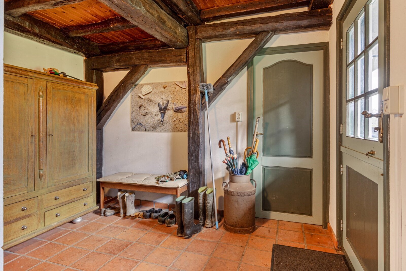 Binnen wordt de ruime hal gekenmerkt door een grijsgemêleerde tegelvloer, die doorloopt in de leefruimtes. De entreehal herbergt een discreet weggewerkte garderobe, een toilet en de prachtige opgaande trap naar de eerste verdieping. Van hieruit leidt de hal naar de woon- en privévertrekken op de begane grond.